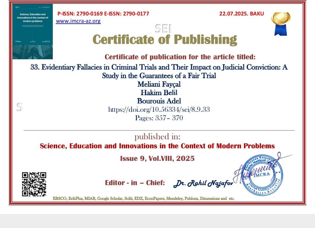 M. BELIL Hakim, (2025-07-22), "Evidentiary Fallacies in Criminal Trials and Their Impact on Judicial Conviction: A Study in the Guarantees of a Fair Trial", [national] Science, Education and Innovations in the Context of Modern Problems , International Meetings and Conferences Research Association
