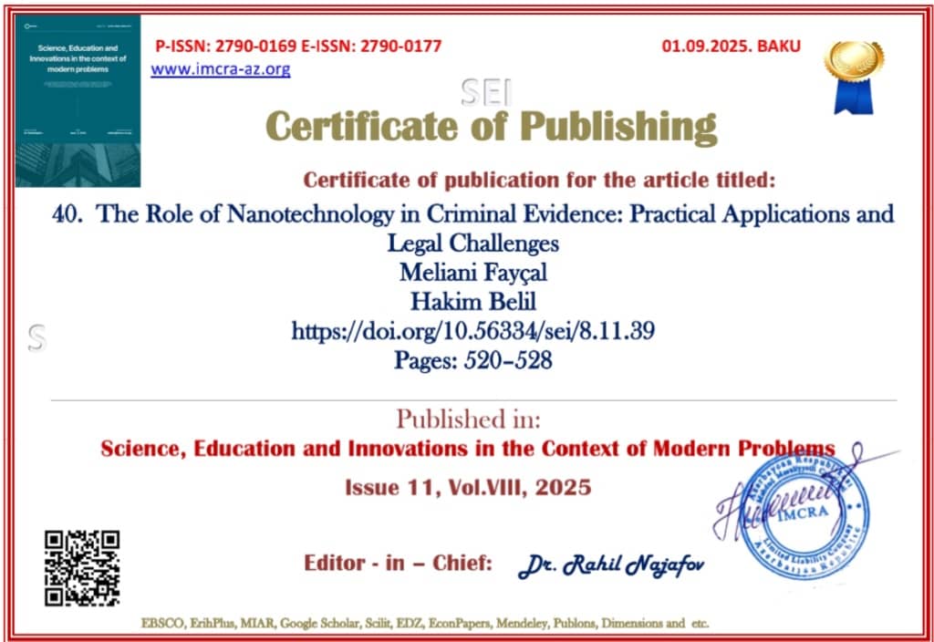 M. BELIL Hakim, (2025-09-01), "The Role of Nanotechnology in Criminal Evidence: Practical Applications and Legal Challenges", [national] Science, Education and Innovations in the Context of Modern Problems , International Meetings and Conferences Research Association