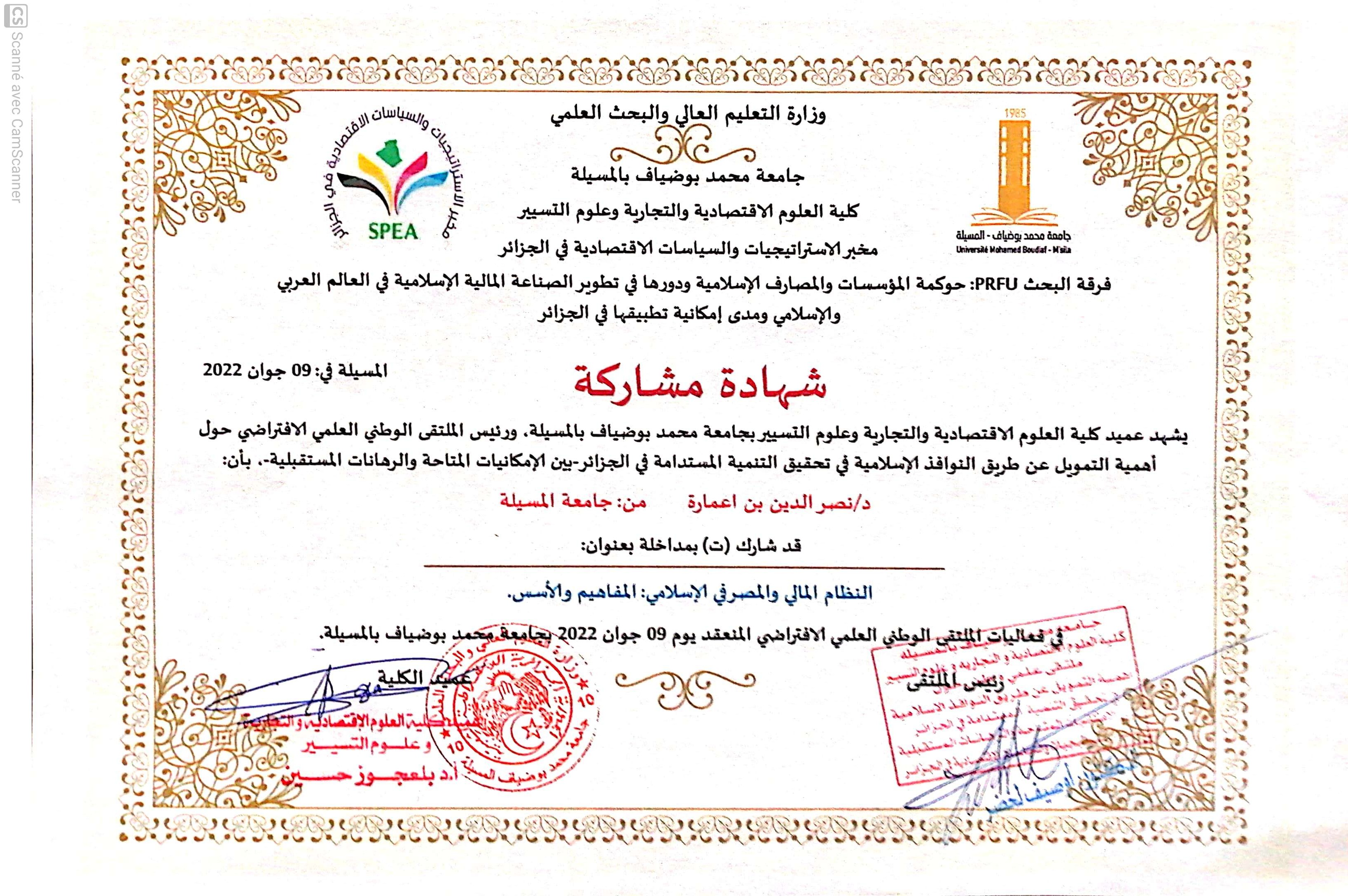 M. BENAMARA Nasreddine, (2016), "فعالية الصيرفة الاسلامية من خلال التمويل بالمشاركة لدعم أنشطة المؤسسات الصغيرة والمتوسطة", [international] التوجهات الحديثة للسياسة المالية للمؤسسة , جامعة محمد بوضياف بالمسيلة