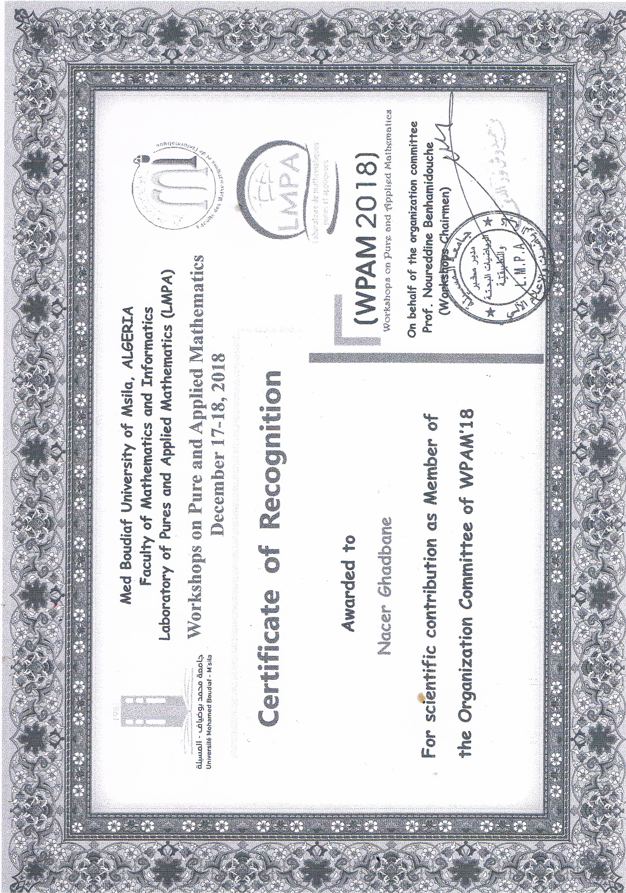 M. GHEDBANE Nasser, (2018), "Decomposition of groups and the wreath product of permutation groups", [national] Workshops on Pure and Applied Mathematics (WPAM'2018) , M'sila