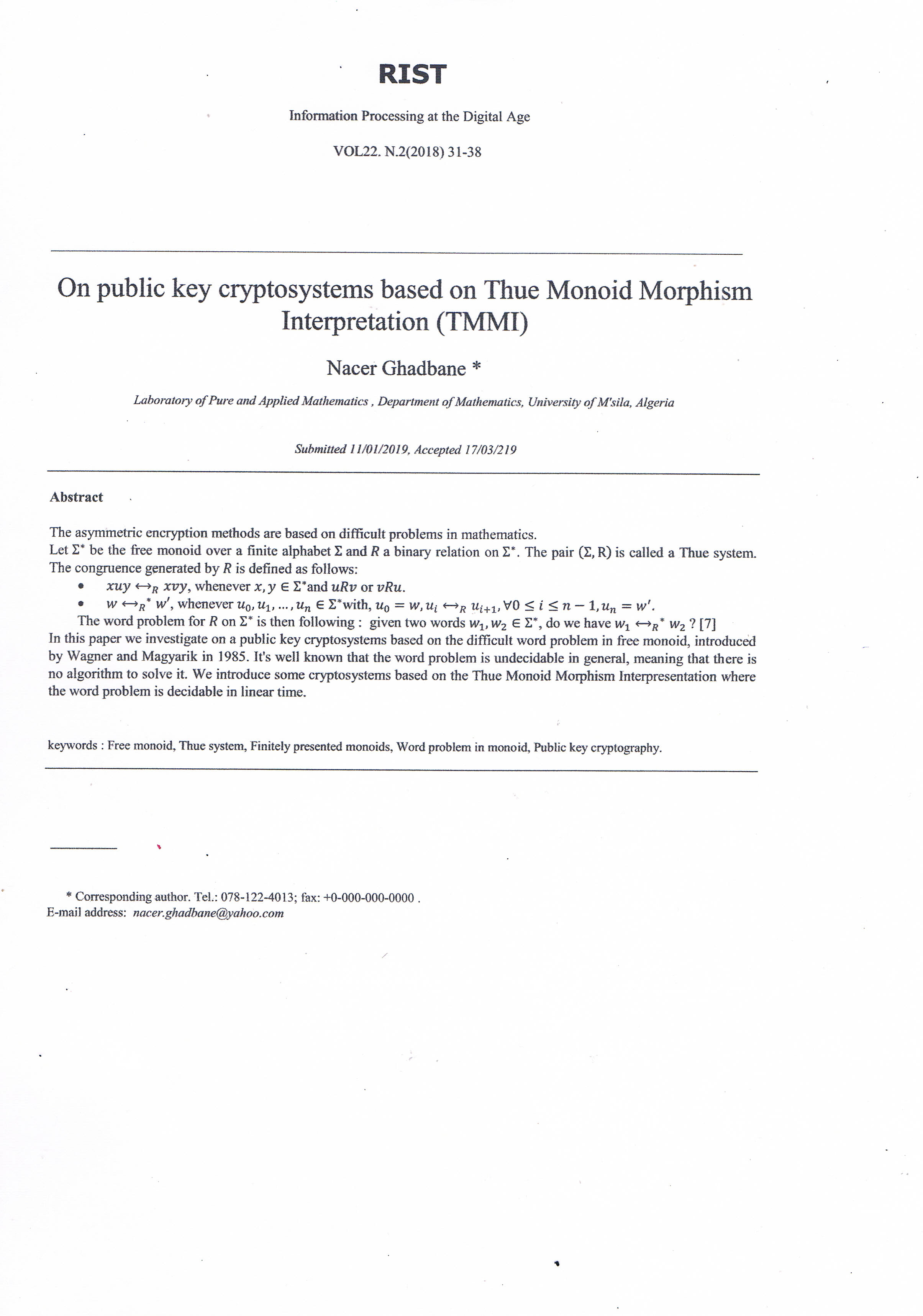 M. GHEDBANE Nasser, (2019), "On public key cryptosystems based on Thue Monoid Morphism Interpretation (TMMI)", [national] Information Processing at the Digital Age , Direction Générale de la Recherche Scientifique et du Développement Technologique
