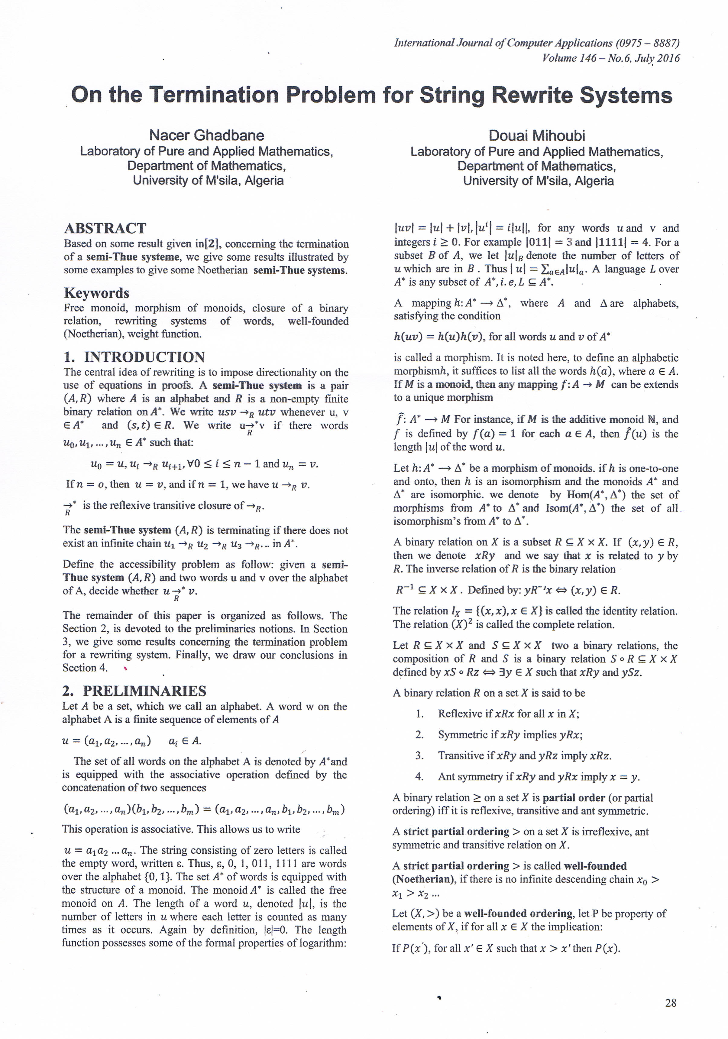 M. GHEDBANE Nasser, (2016), "On the Termination Problem for String Rewrite Systems", [national] International Journal of Computer Applications , University of Lincoln