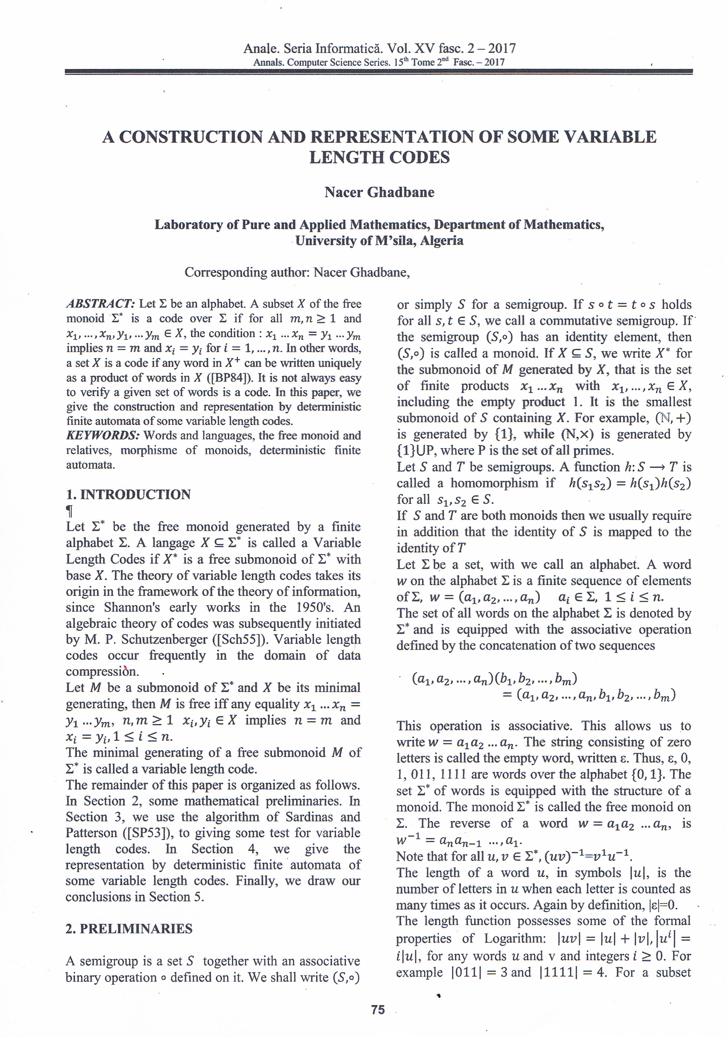 M. GHEDBANE Nasser, (2017), "A construction and representation of some variable length codes", [national] Anale. Seria Informatică , Tibiscus University
