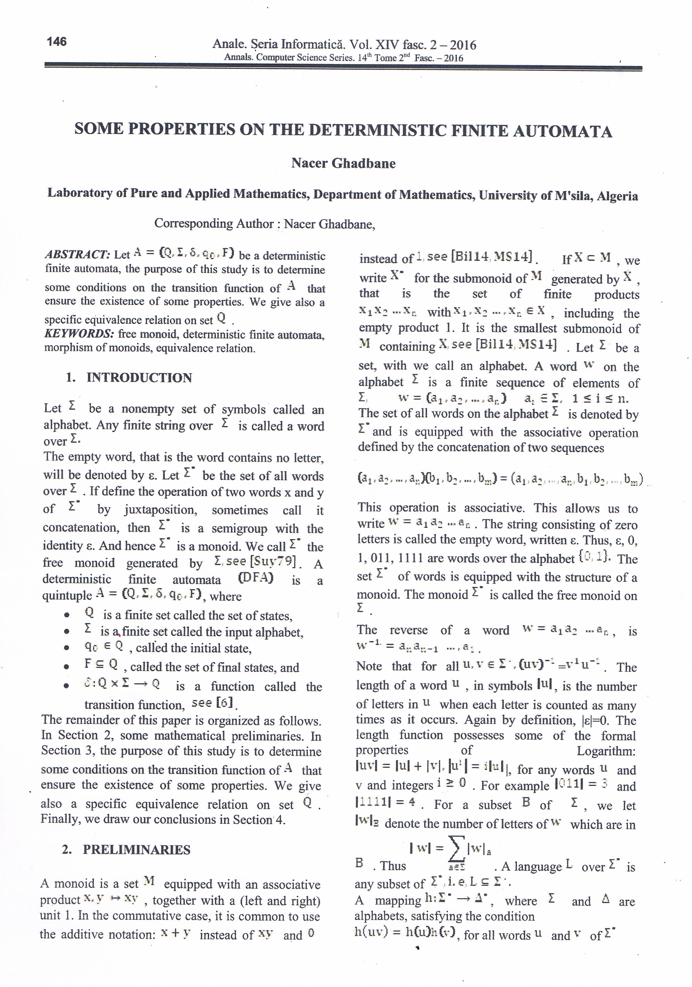 M. GHEDBANE Nasser, (2016), "SOME PROPERTIES ON THE DETERMINISTIC FINITE AUTOMATA.", [national] Annals. Computer Science Series , Tibiscus University