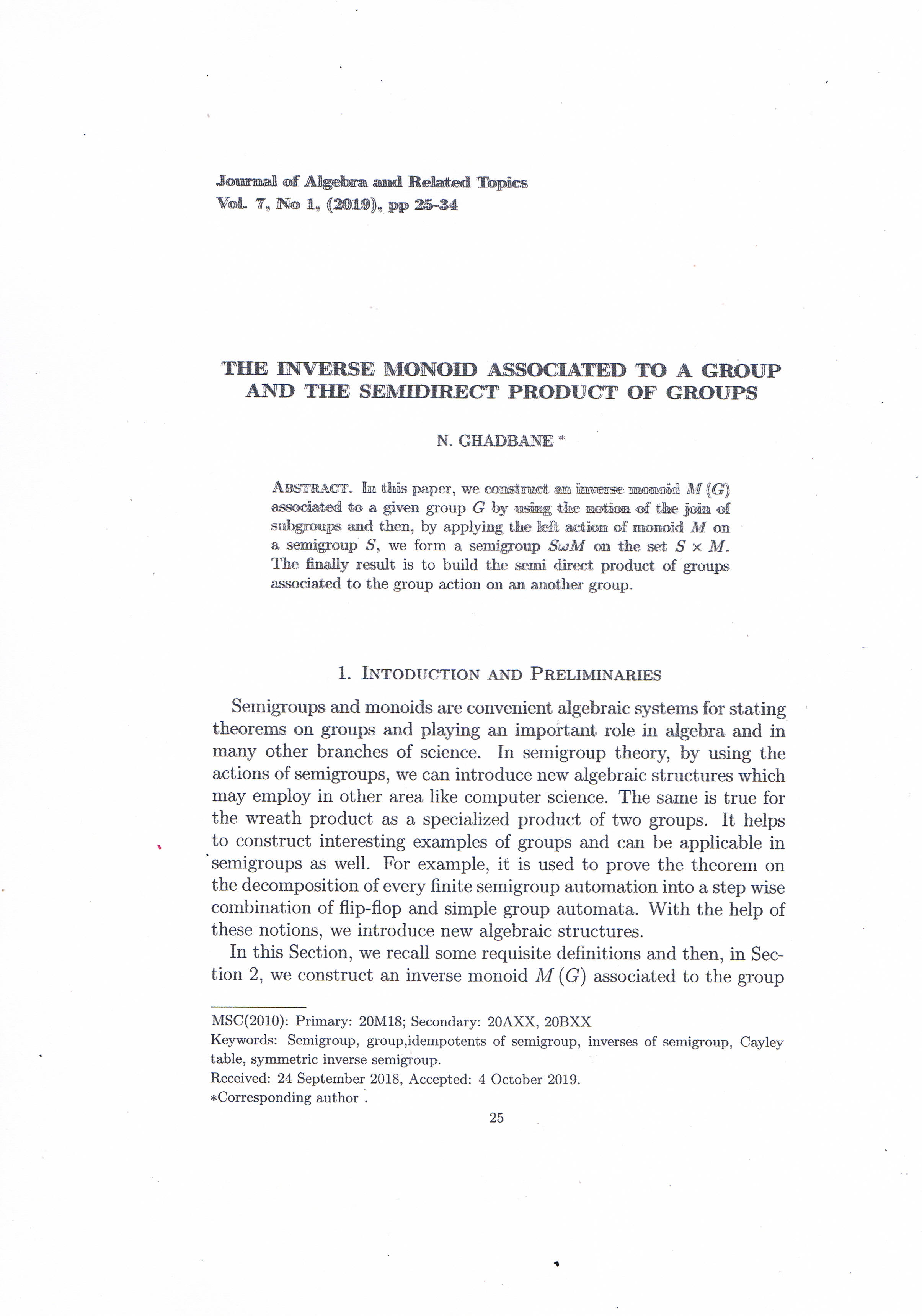 M. GHEDBANE Nasser, (2019), "THE INVERSE MONOID ASSOCIATED TO A GROUP AND THE SEMIDIRECT PRODUCT OF GROUPS", [national] Journal of Algebra and Related Topics , Faculty of Mathematical Sciences, University of Guilan, P.O. Box 1914, Rasht, Iran.