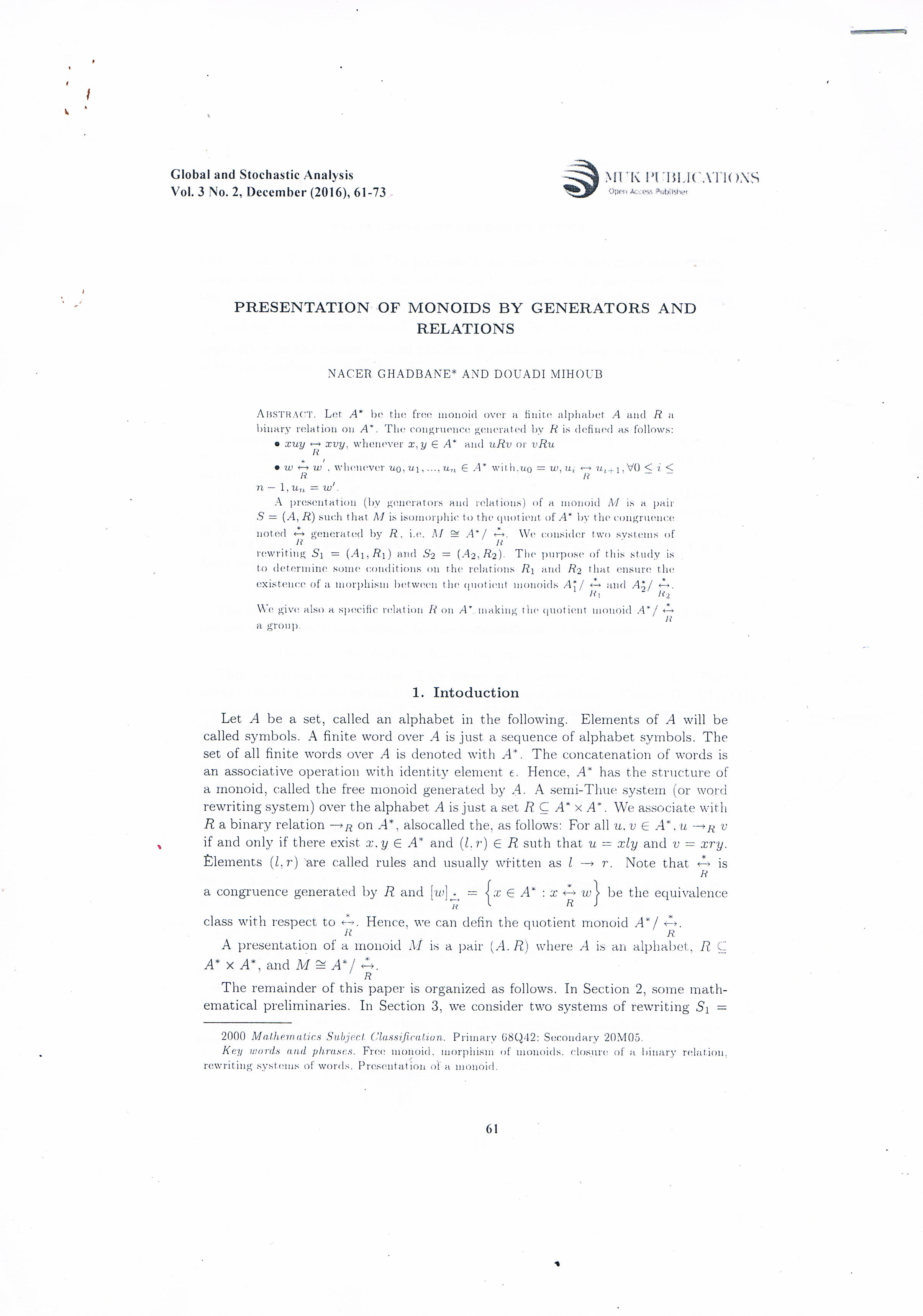 M. GHEDBANE Nasser, (2016), "PRESENTATION OF MONOIDS BY GENERATORS AND RELATIONS", [national] Global and Stochastic Analysi , MUK publications
