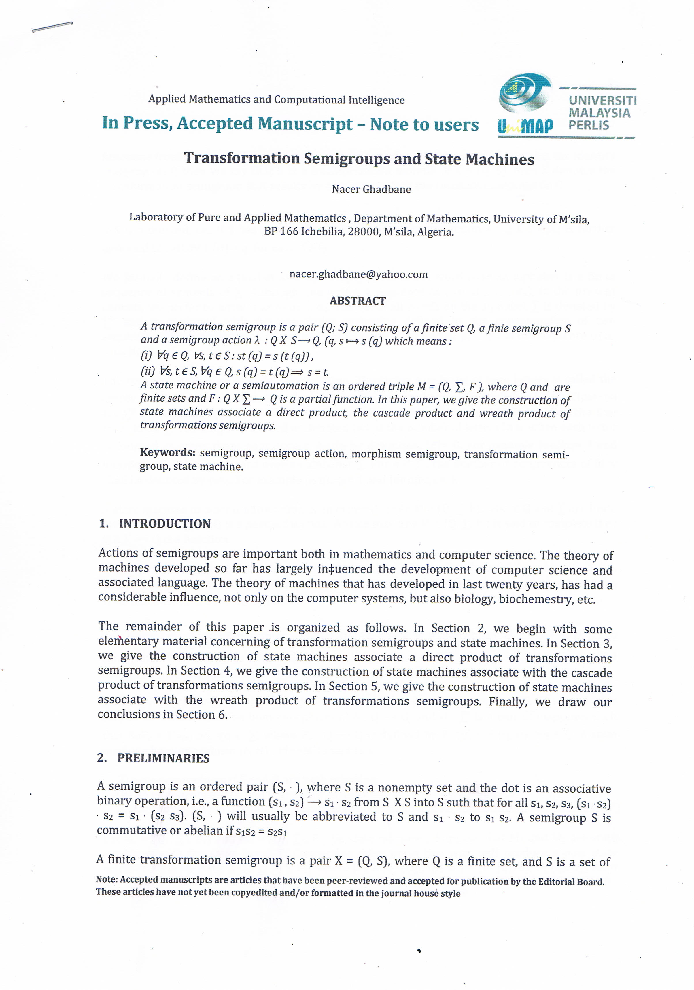 M. GHEDBANE Nasser, (2019), "Transformation Semigroups and State Machines", [national] Applied Mathematics and Computational Intelligence , APPLIED MATHEMATICS AND COMPUTATIONAL INTELLIGENCE (AMCI) PENERBIT UniMAP (UniMAP PRESS) Universiti Malaysia Perlis