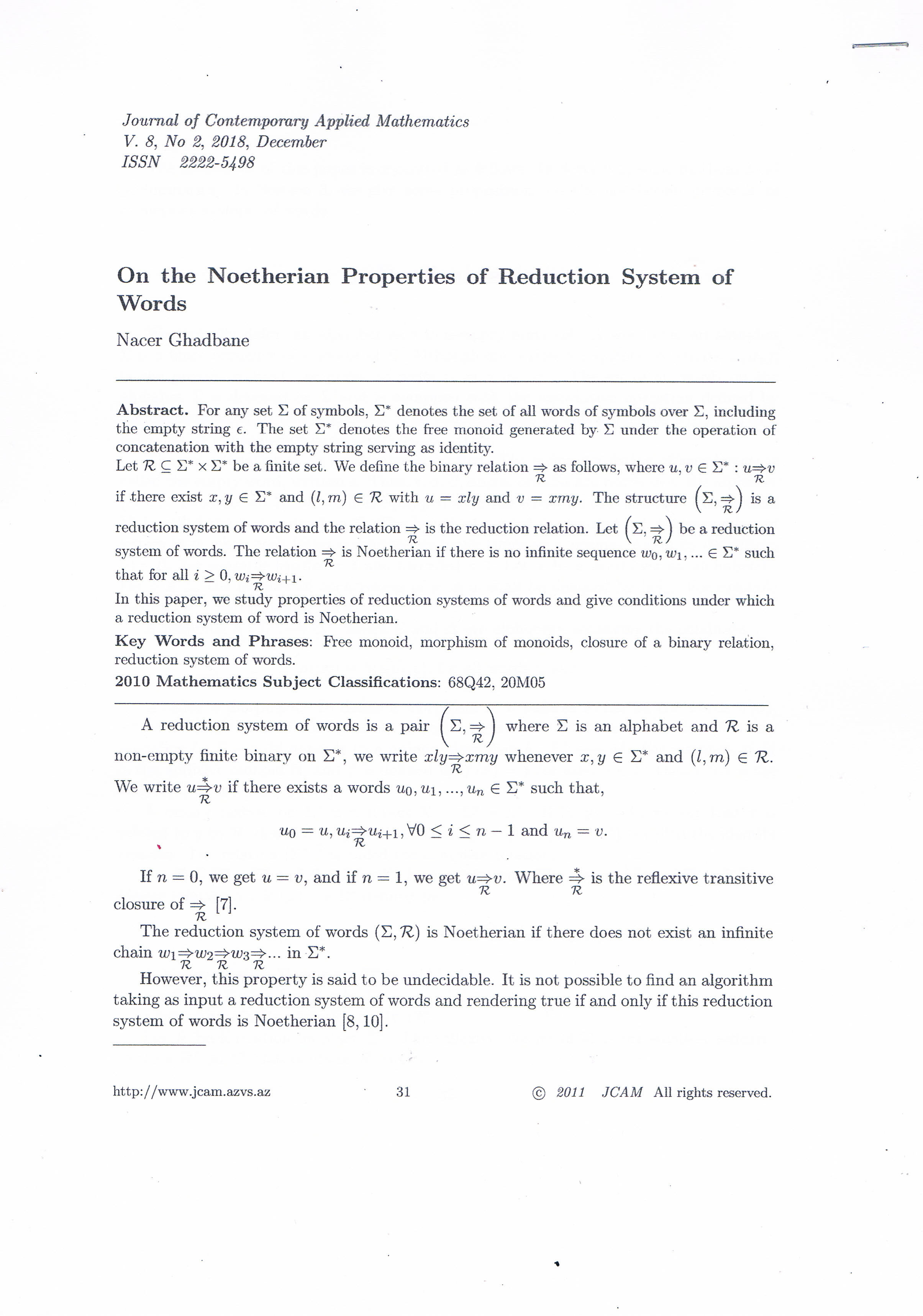M. GHEDBANE Nasser, (2018), "On the Noetherian Properties of Reduction System of Words", [national] Journal of Contemporary Applied Mathematics , Institute of Mathematics and Mechanics NAS of Azerbaijan, Baku, Azerbaijan