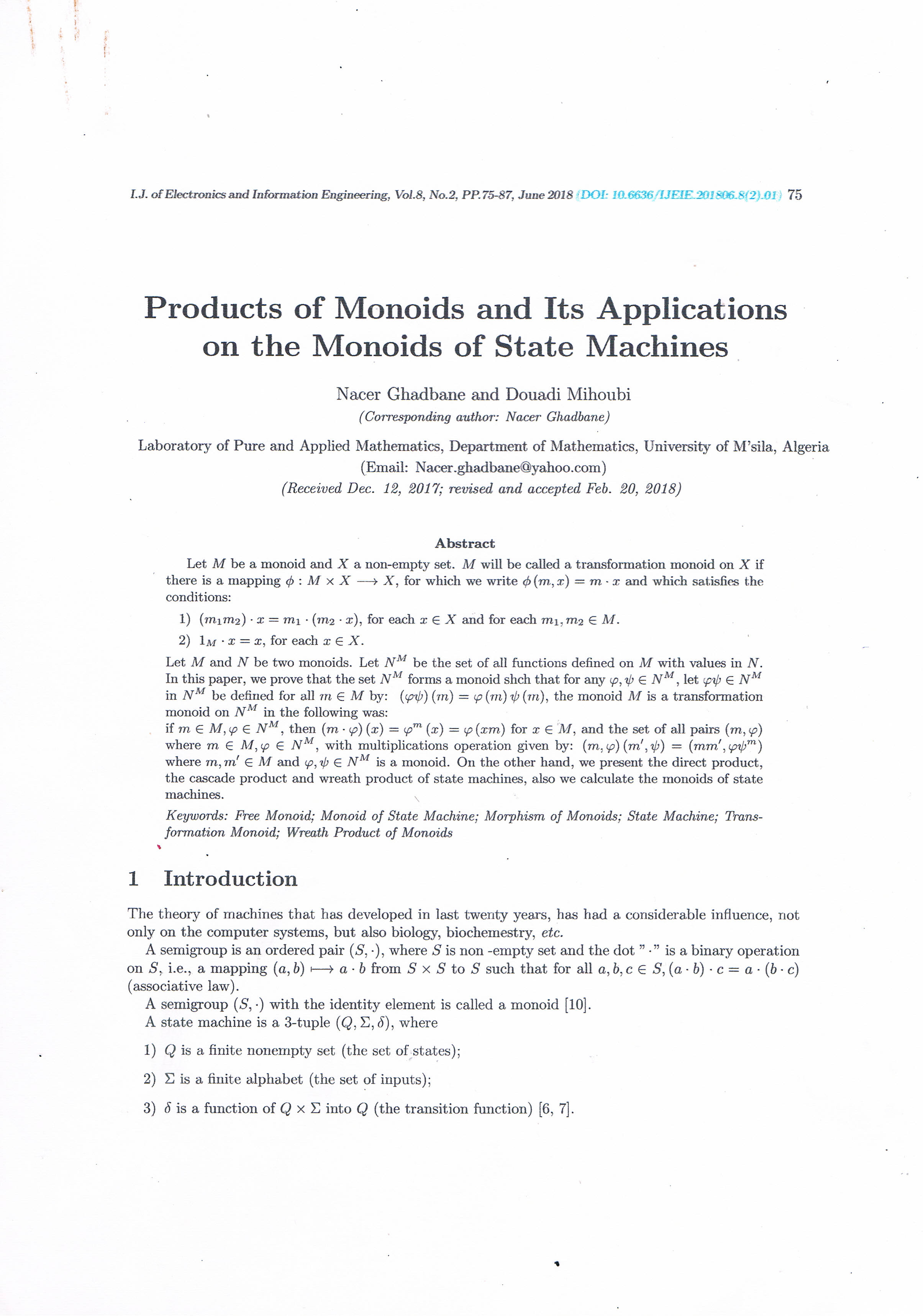M. GHEDBANE Nasser, (2018), "Products of Monoids and Its Applications on the Monoids of State Machines", [national] International Journal of Electronics and Information Engineering , Asia University