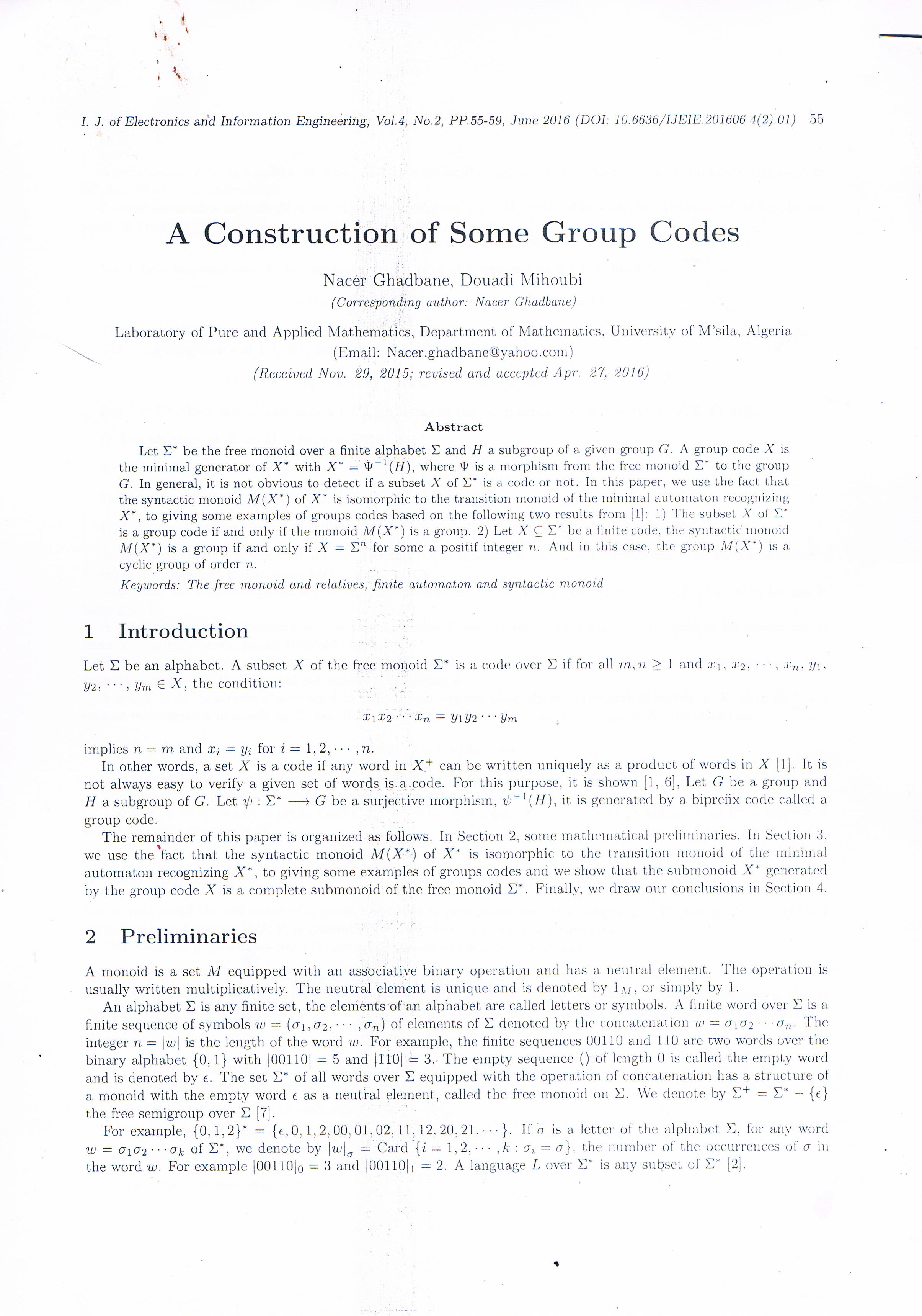 M. GHEDBANE Nasser, (2016), "A Construction of Some Group Codes", [international] International Journal of Electronics and Information Engineering , Asia University