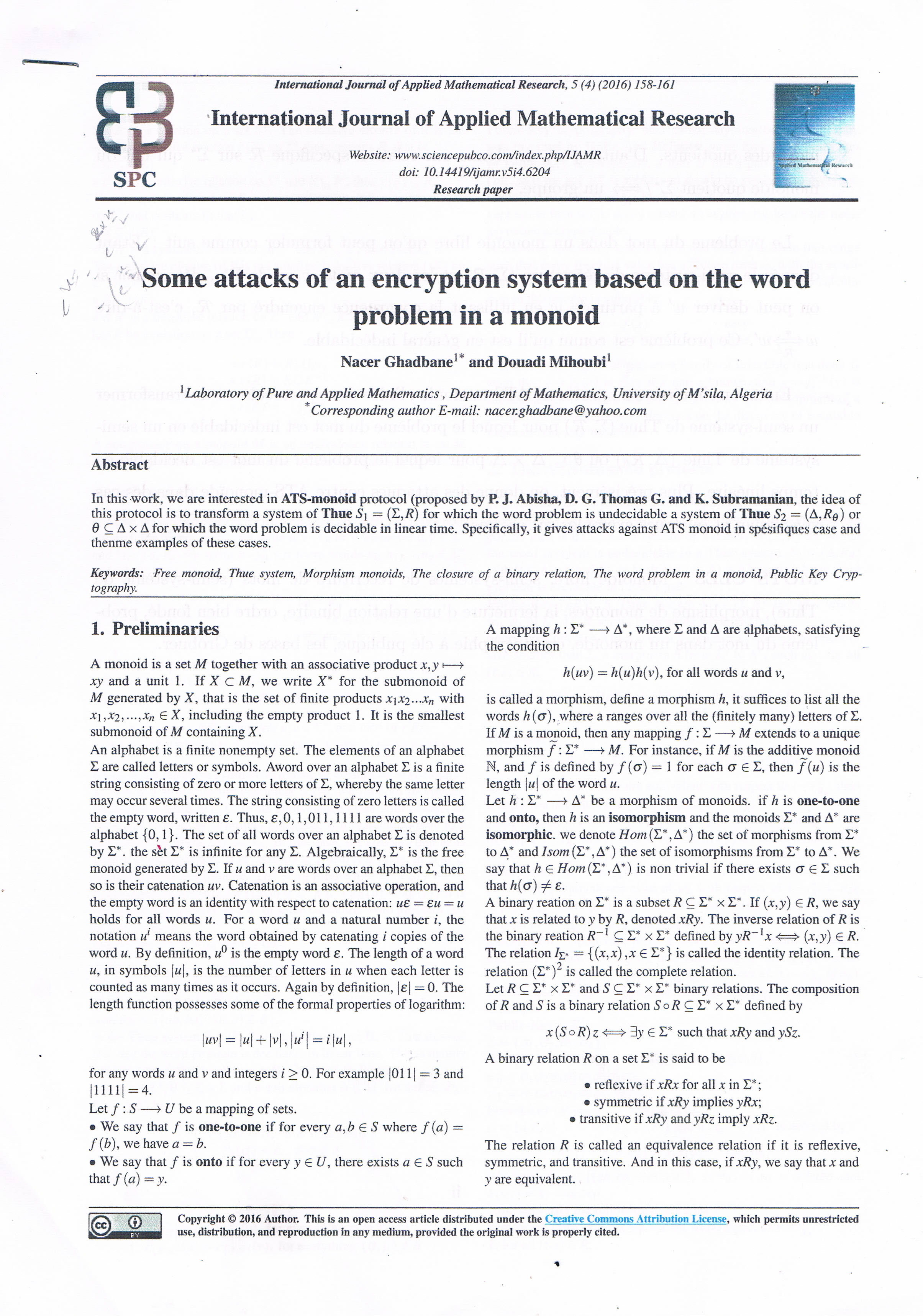 M. GHEDBANE Nasser, (2016), "Some attacks of an encryption system based on the word problem in a monoid", [national] International Journal of Applied Mathematics Research , Science Publishing Corporation