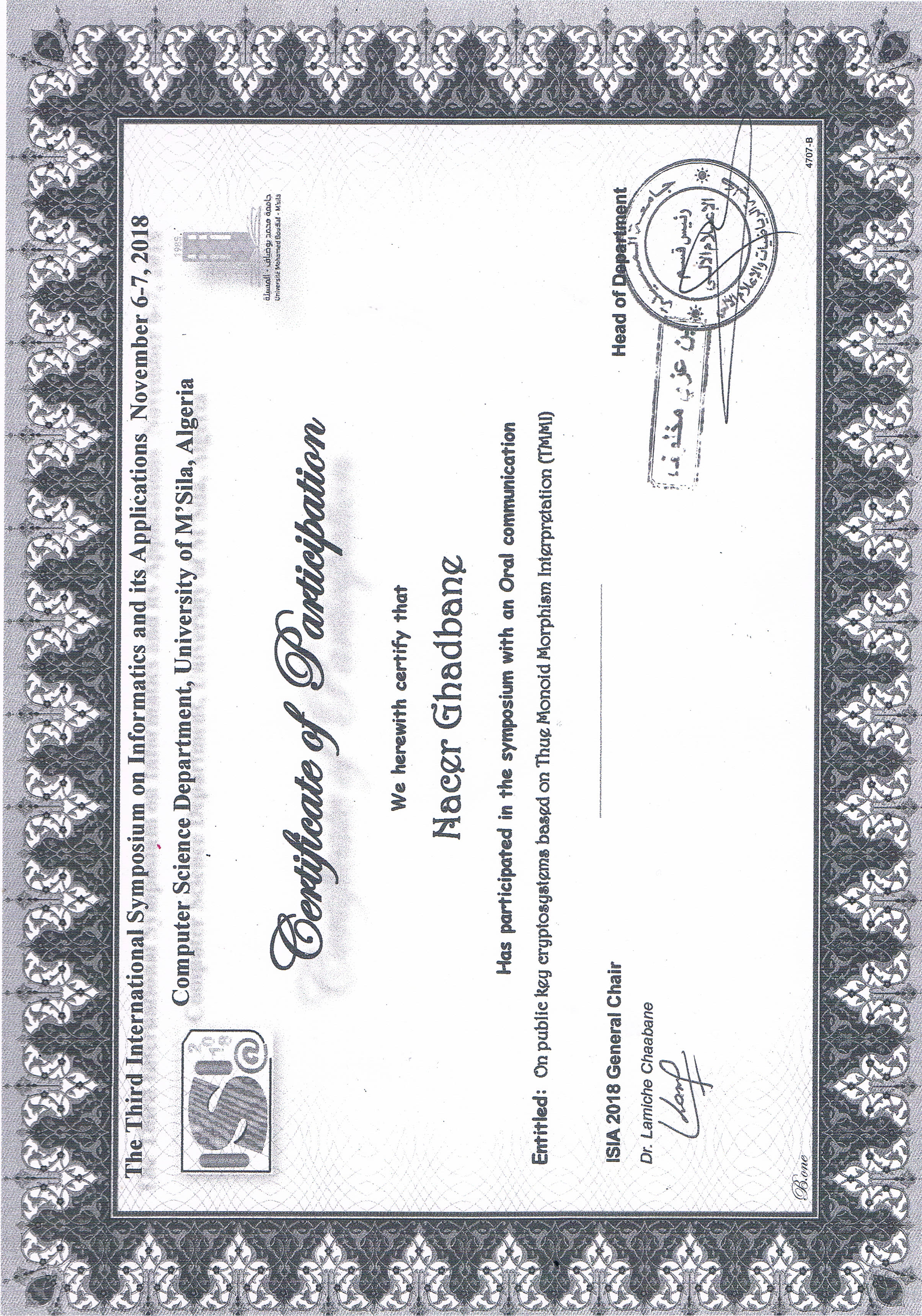 M. GHEDBANE Nasser, (2018), "On public-key cryptosystems based on Thue Monoid Morphism Interpretation (TMMI)", [international] The 3rd International Symposium on Informatics and its Applications ISIA 2018 , M'sila