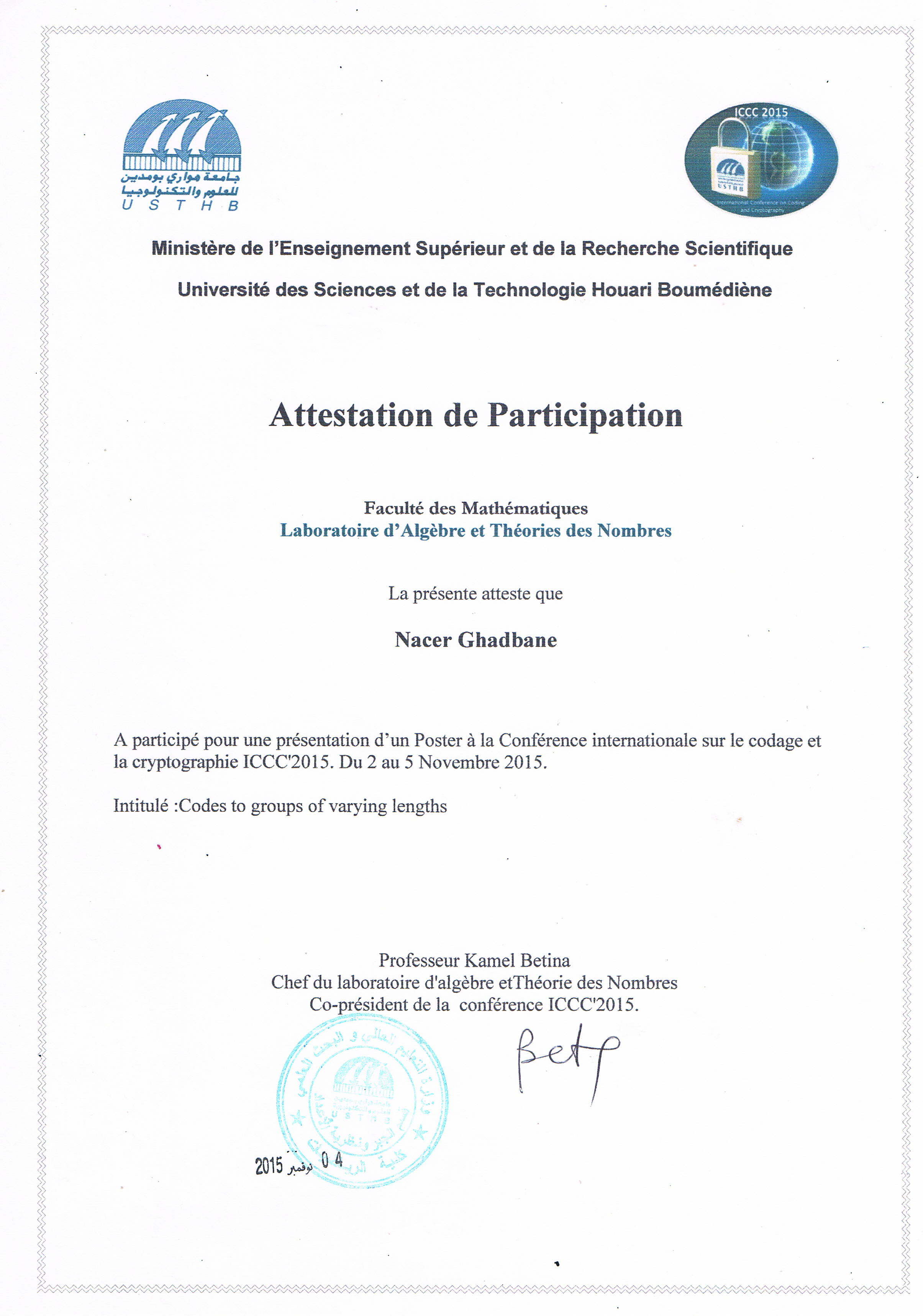 M. GHEDBANE Nasser, (2015), "Codes to groups of varying lengths", [international] Conférence internationale sur le codage et la cryptographie ICCC'2015 , USTHB