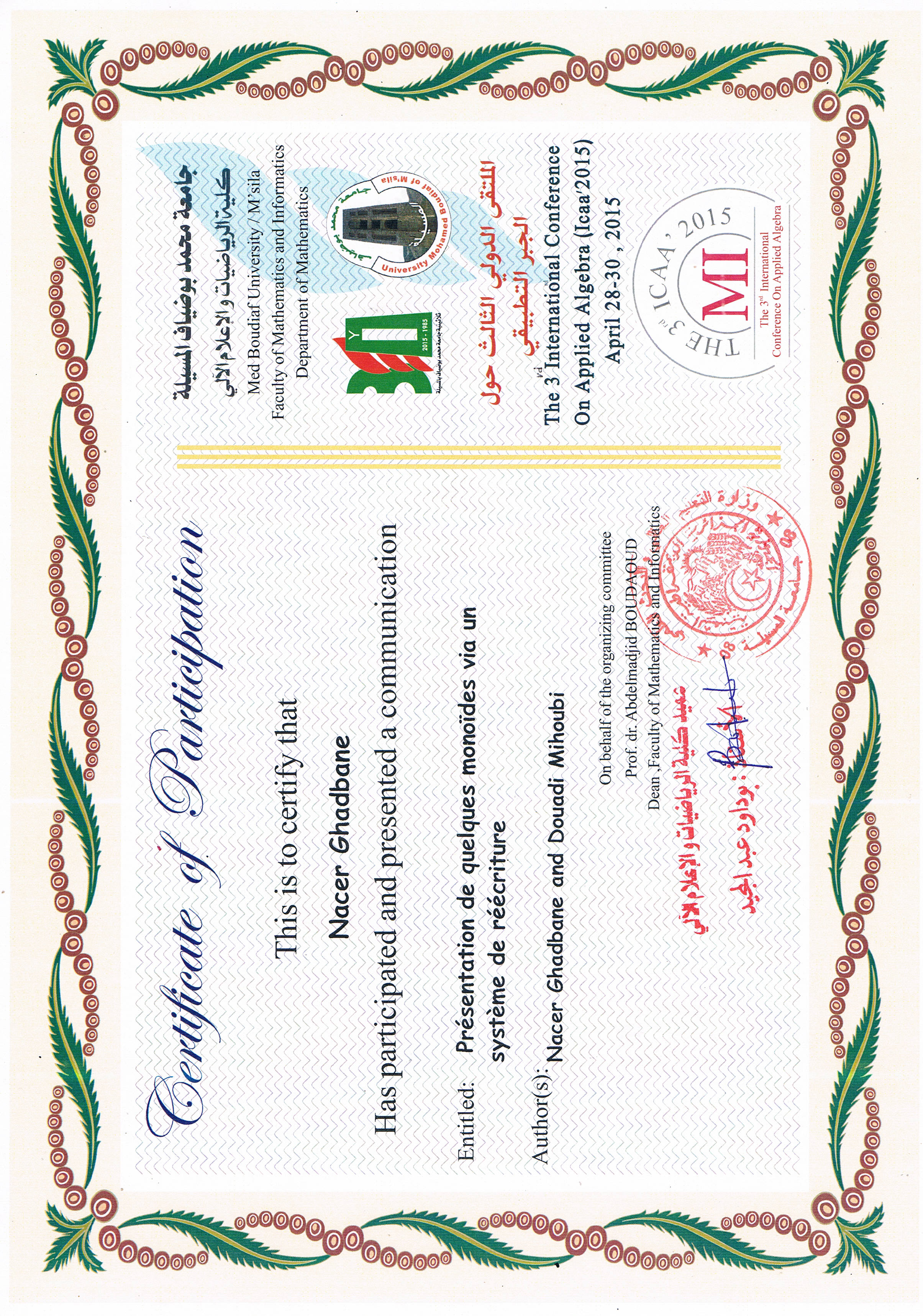 M. GHEDBANE Nasser, (2015), "Présentation de quelques monoïdes via un système de réécriture", [international] International conference on applied algebra (ICAA 2015) , M'sila