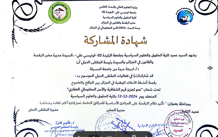 M. MARWA Fridja, (2024-12-12), "تأثير نظام الرقمنة على المبادئ الأساسية للمرافق العامة: نحو إدارة أكثر كفاءة وشفافية"", [international] رقمنة أنشطة الاملاك الوطنية في الجزائر بين الواقع والطموح , جامعة البليدة