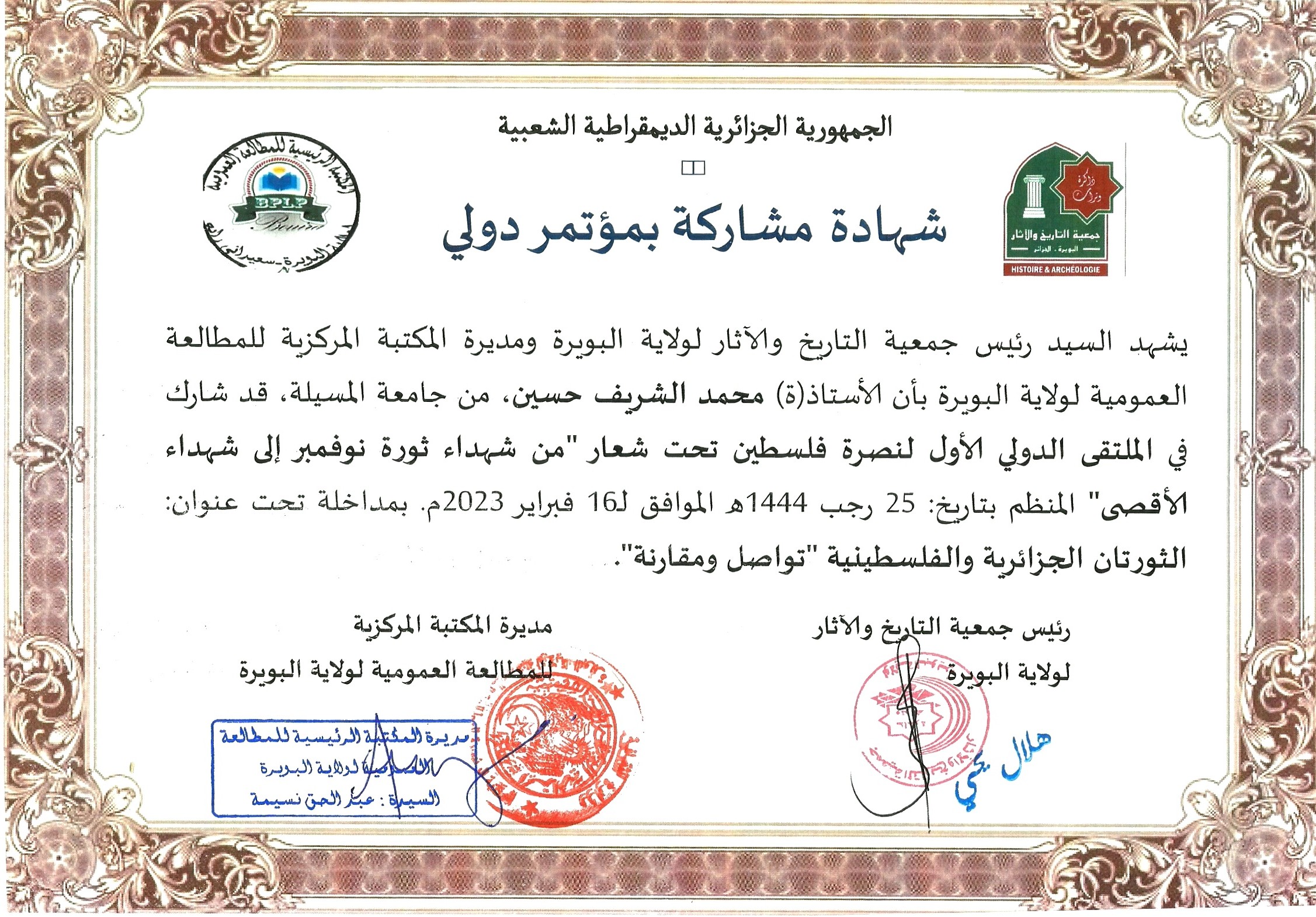 M. MOHAMMED CHERIF Hocine, (2023), "الثورتان الجزائرية والفلسطينية.. تواصل ومقارنة", [international] من شهداء ثورة نوفمبر إلى شهداء ثورة الأقصى , ولاية البويرة
