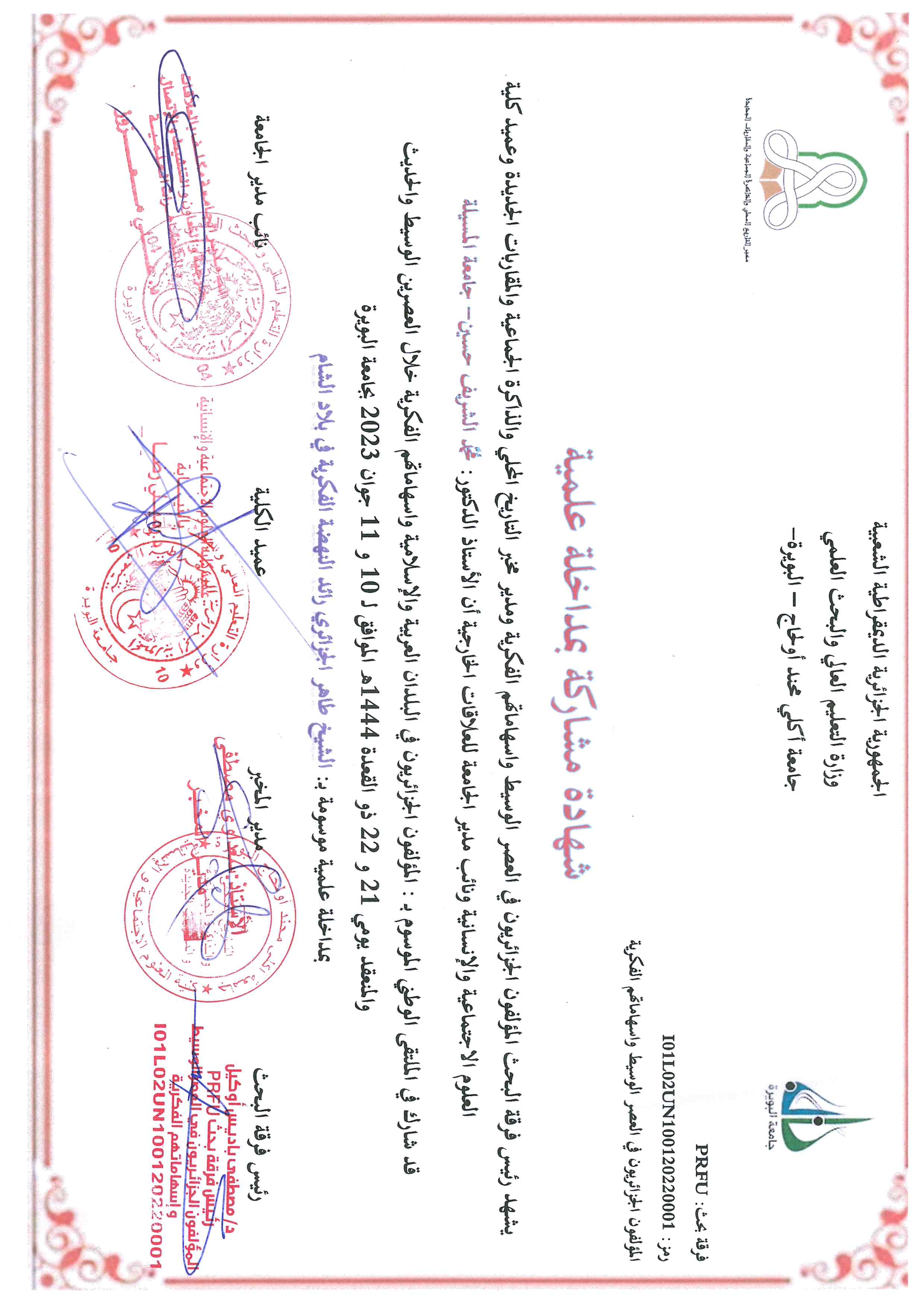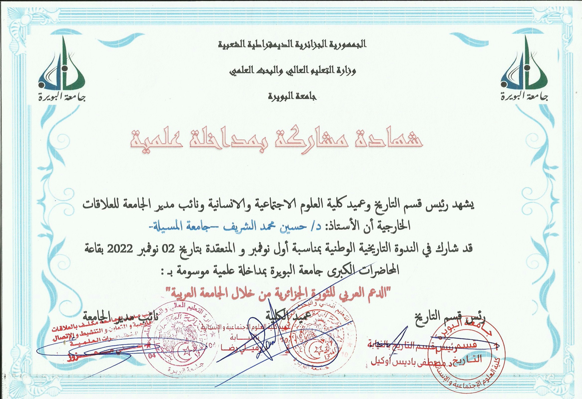 M. MOHAMMED CHERIF Hocine, (2022), "الدعم العربي للثورة الجزائرية من خلال الجامعة العربية", [national] الندوة التاريخية الوطنية بمناسبة أول نوفمبر , جامعة البويرة