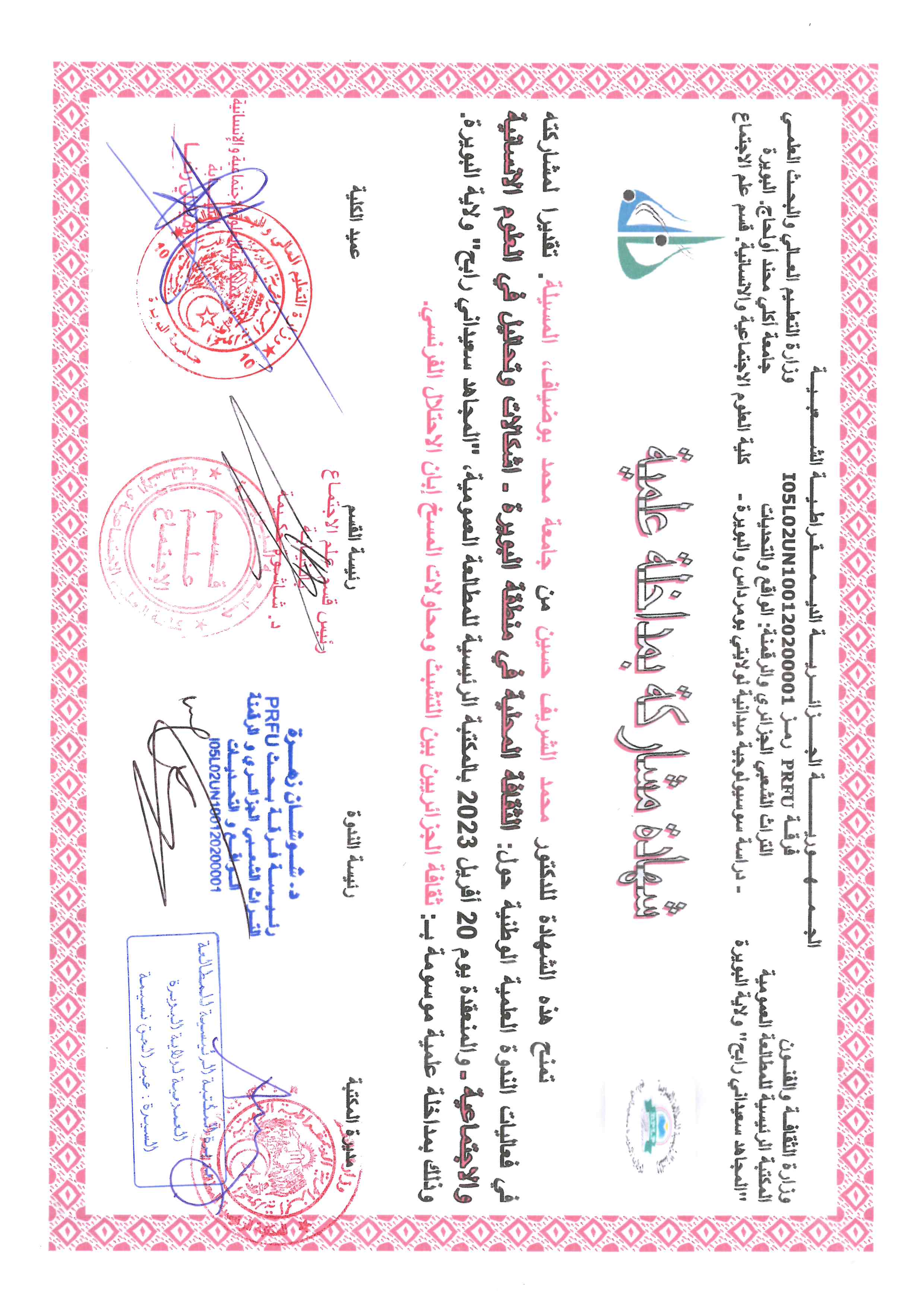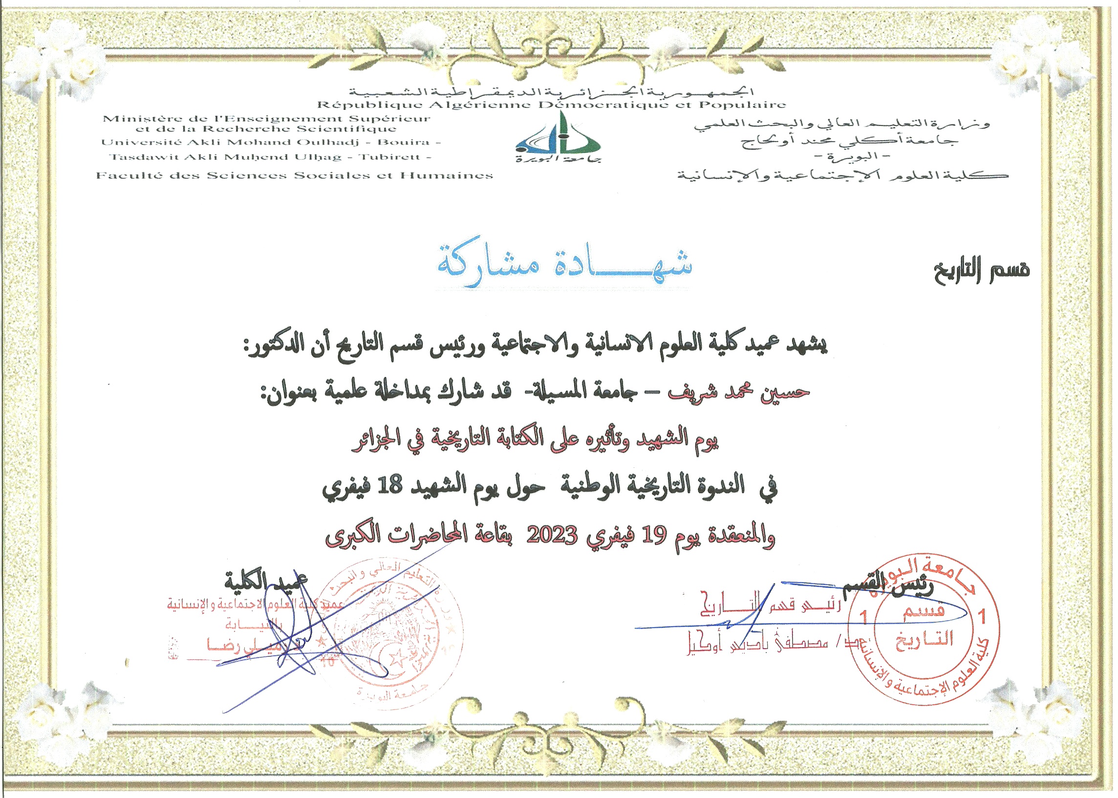 M. MOHAMMED CHERIF Hocine, (2023), "يوم الشهيد وتأثيره على الكتابة التاريخية في الجزائر", [national] الندوة الوطنية بمناسبة يوم الشهيد , جامعة البويرة