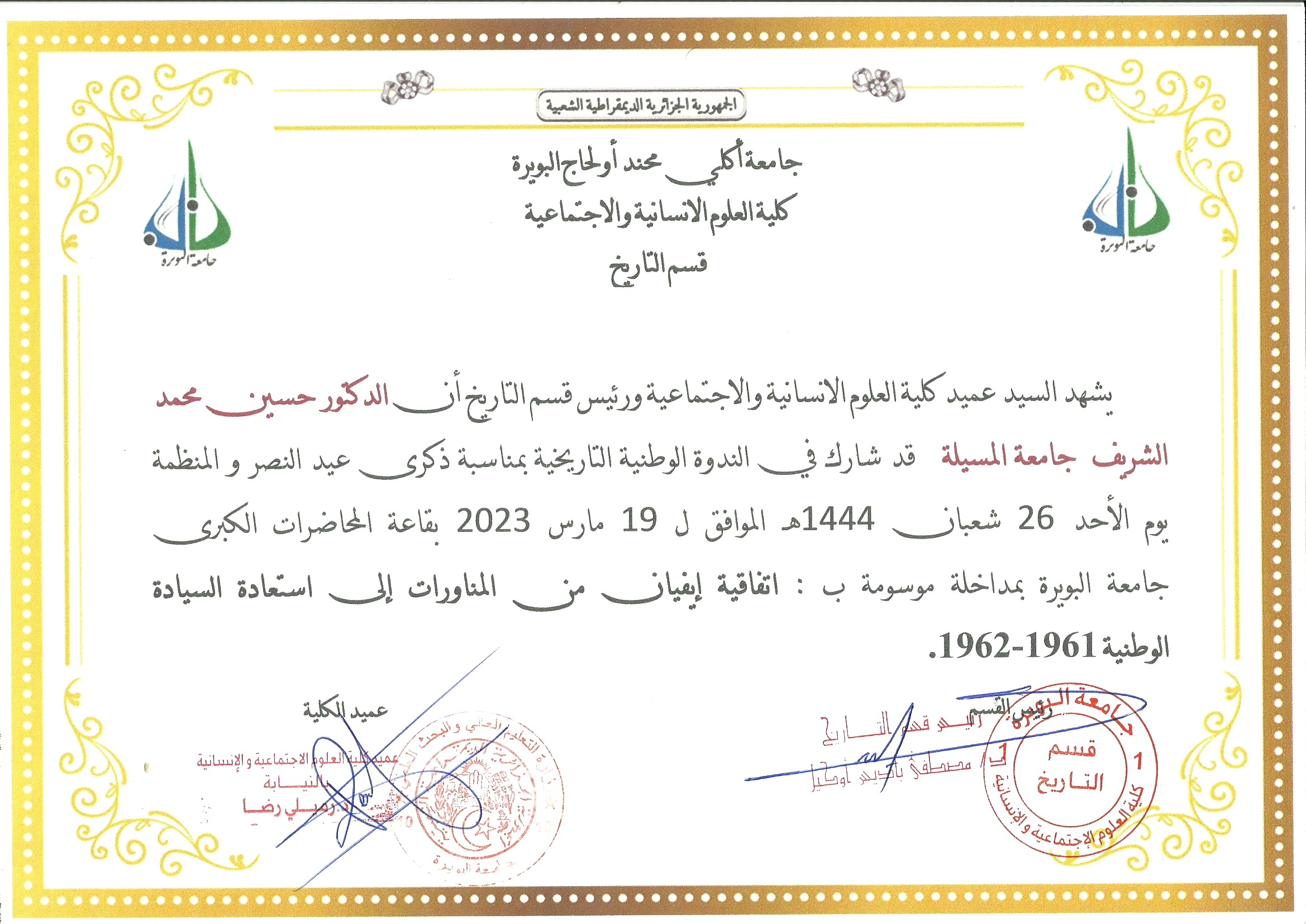 M. MOHAMMED CHERIF Hocine, (2023), "اتفاقية إيفيان من المناورات إلى استعادة السيادة الوطنية (1961-1962)", [national] ندوة وطنية بمناسية عيد النصر 19 مارس 1962 , جامعة البويرة