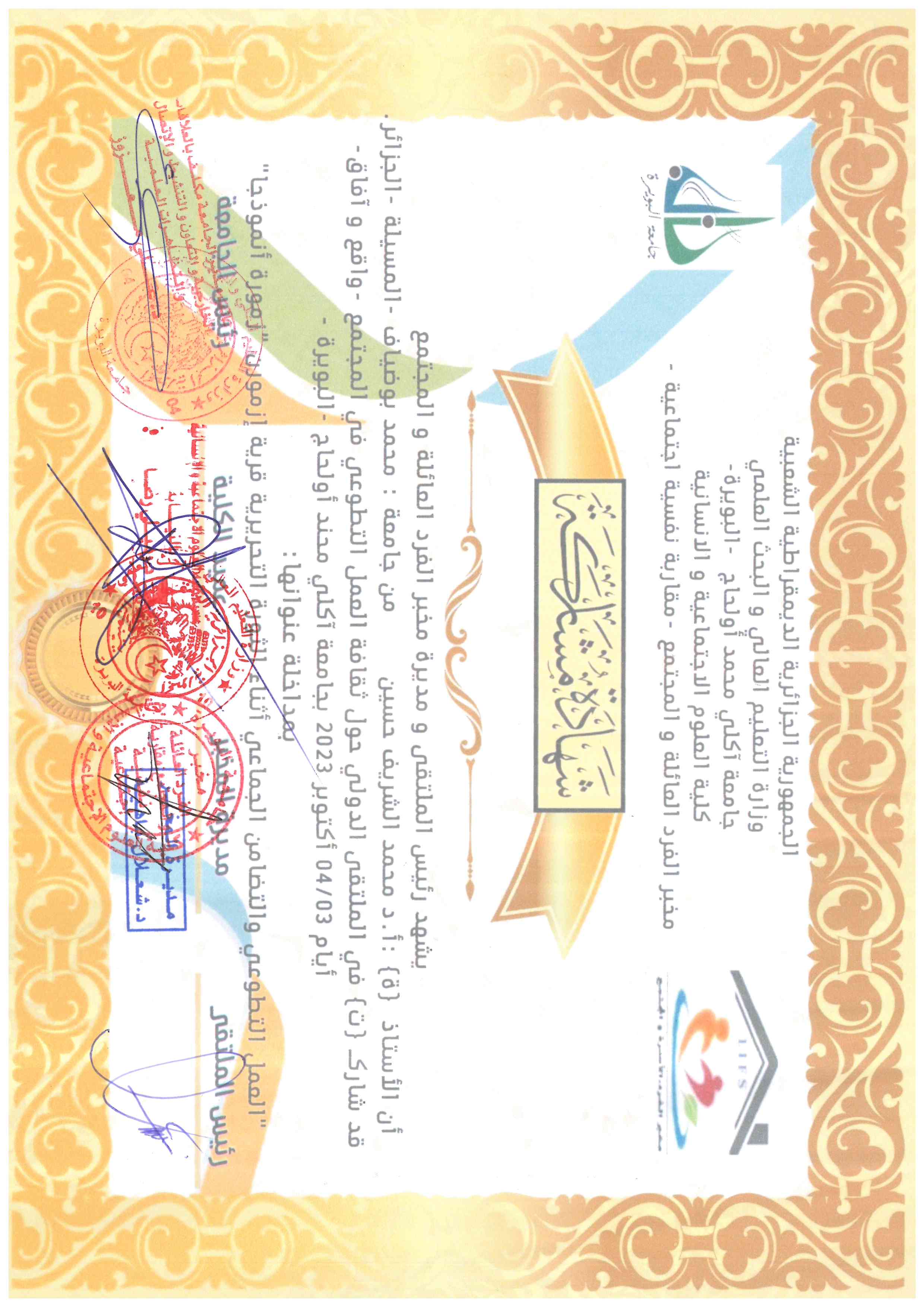 M. MOHAMMED CHERIF Hocine, (2023-10-03), "العمل التطوعي والتضامن الجماعي أثناء الثورة التحريرية.. قرية إزمورن "زمورة أنموذجا"", [international] ثقافة العمل التطوعي في المجتمع.. واقع وآفاق , جامعة البويرة