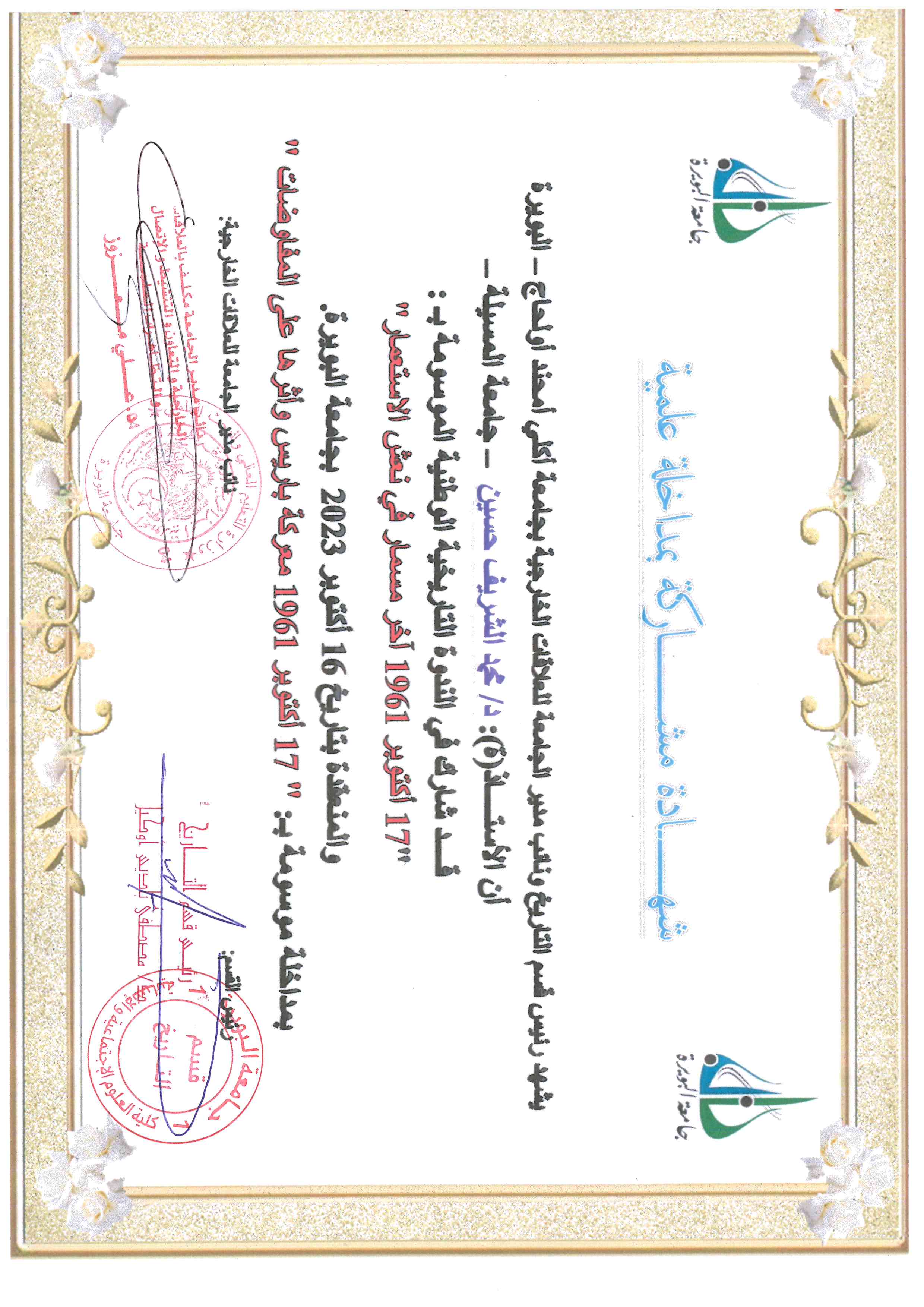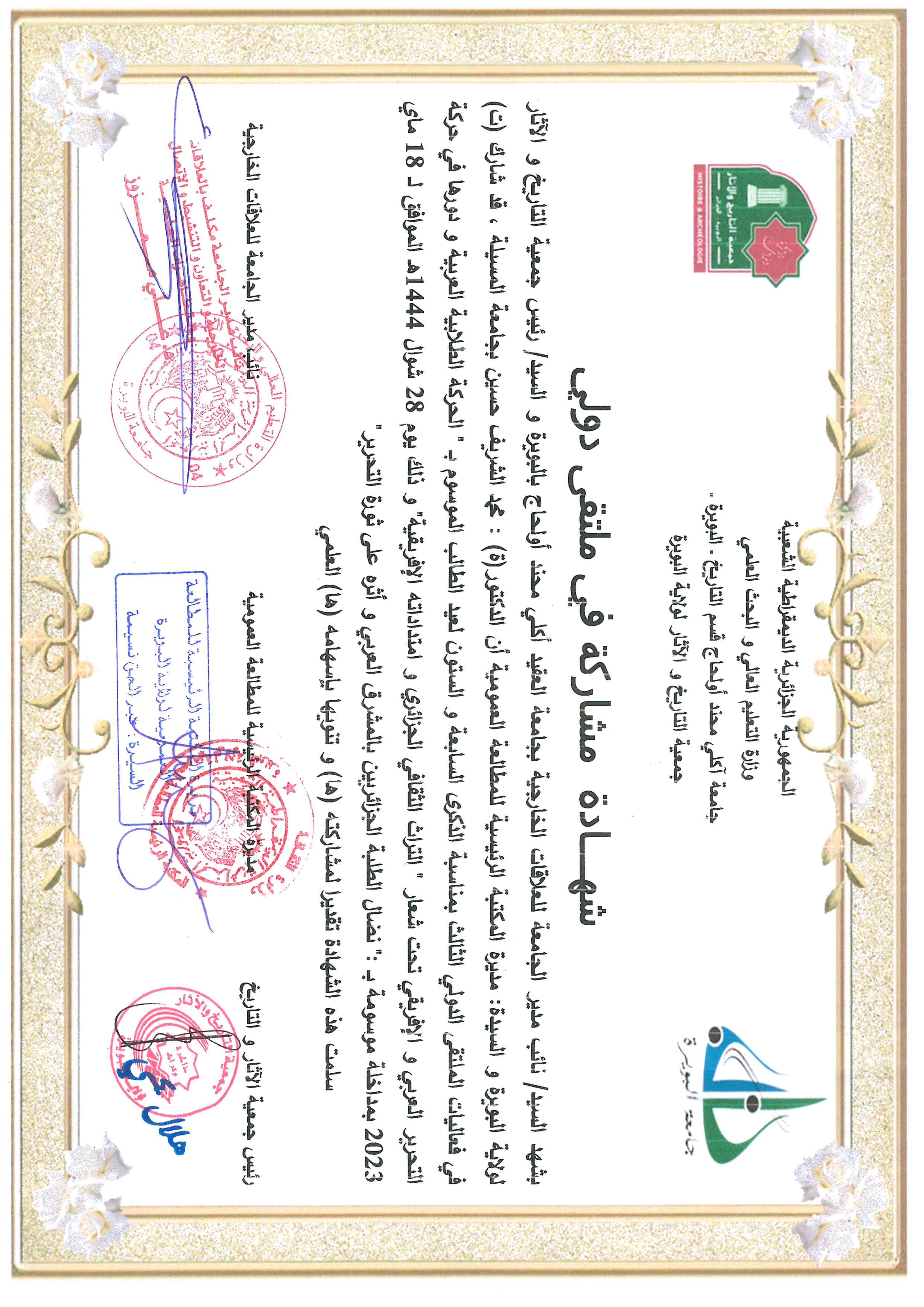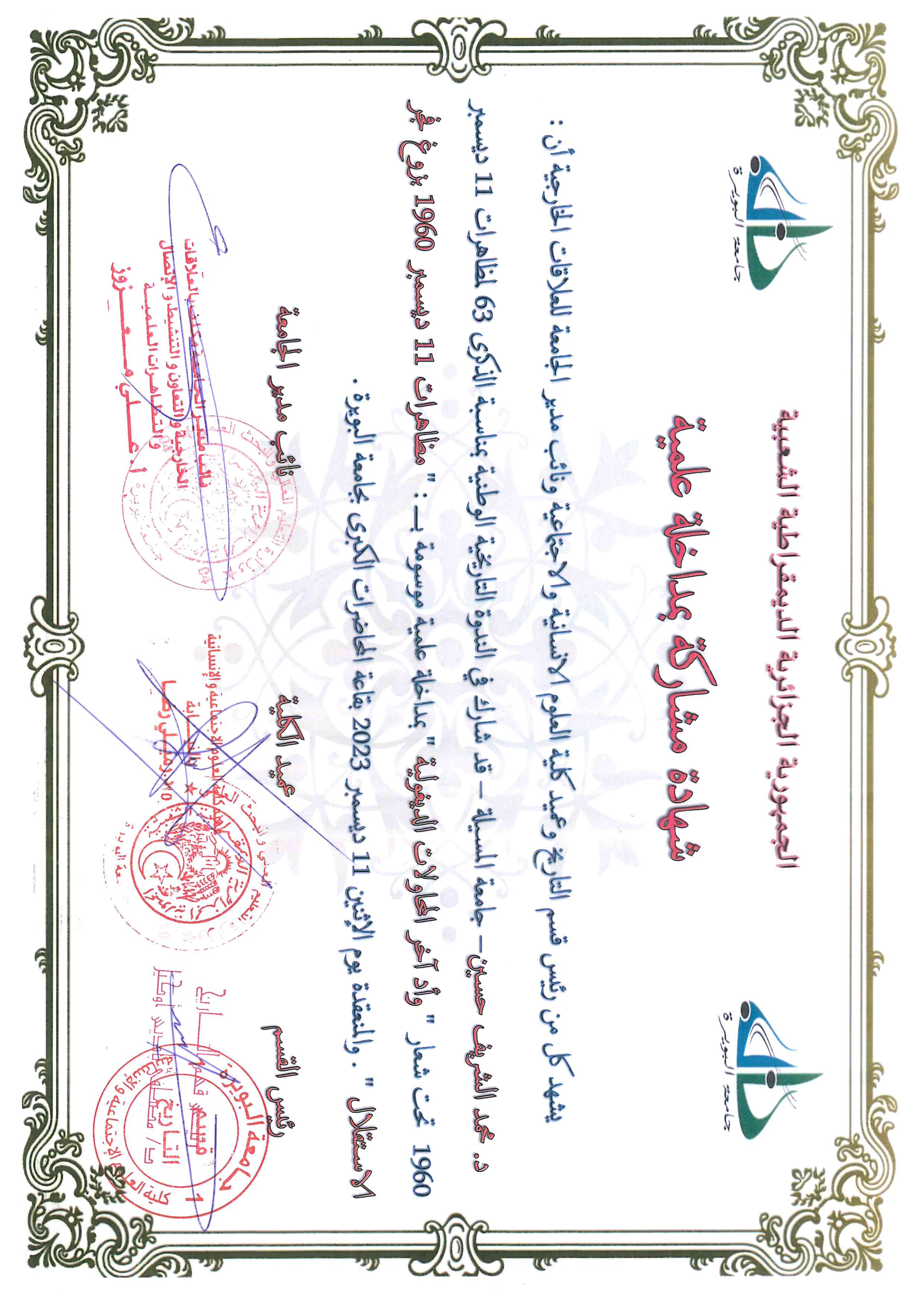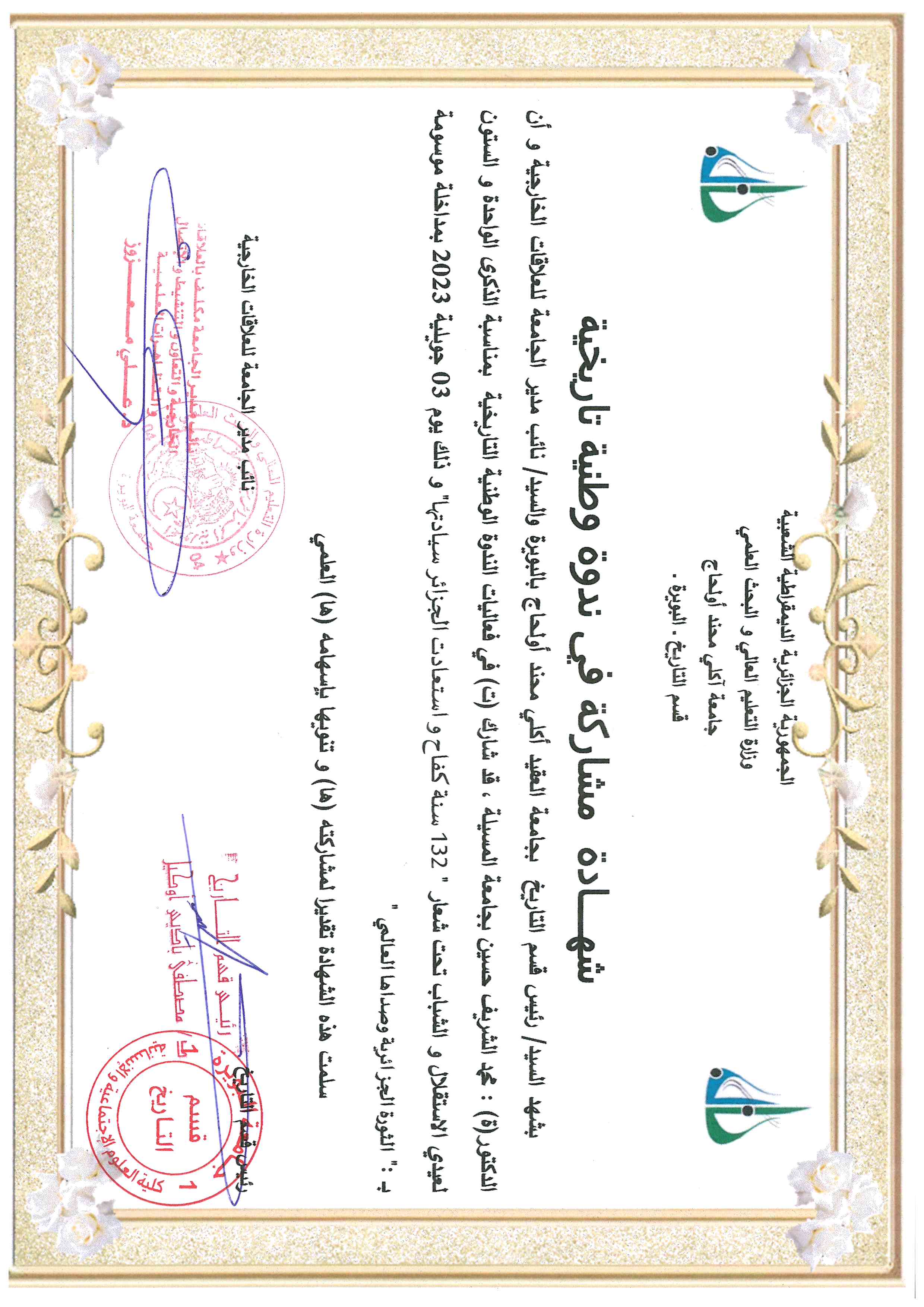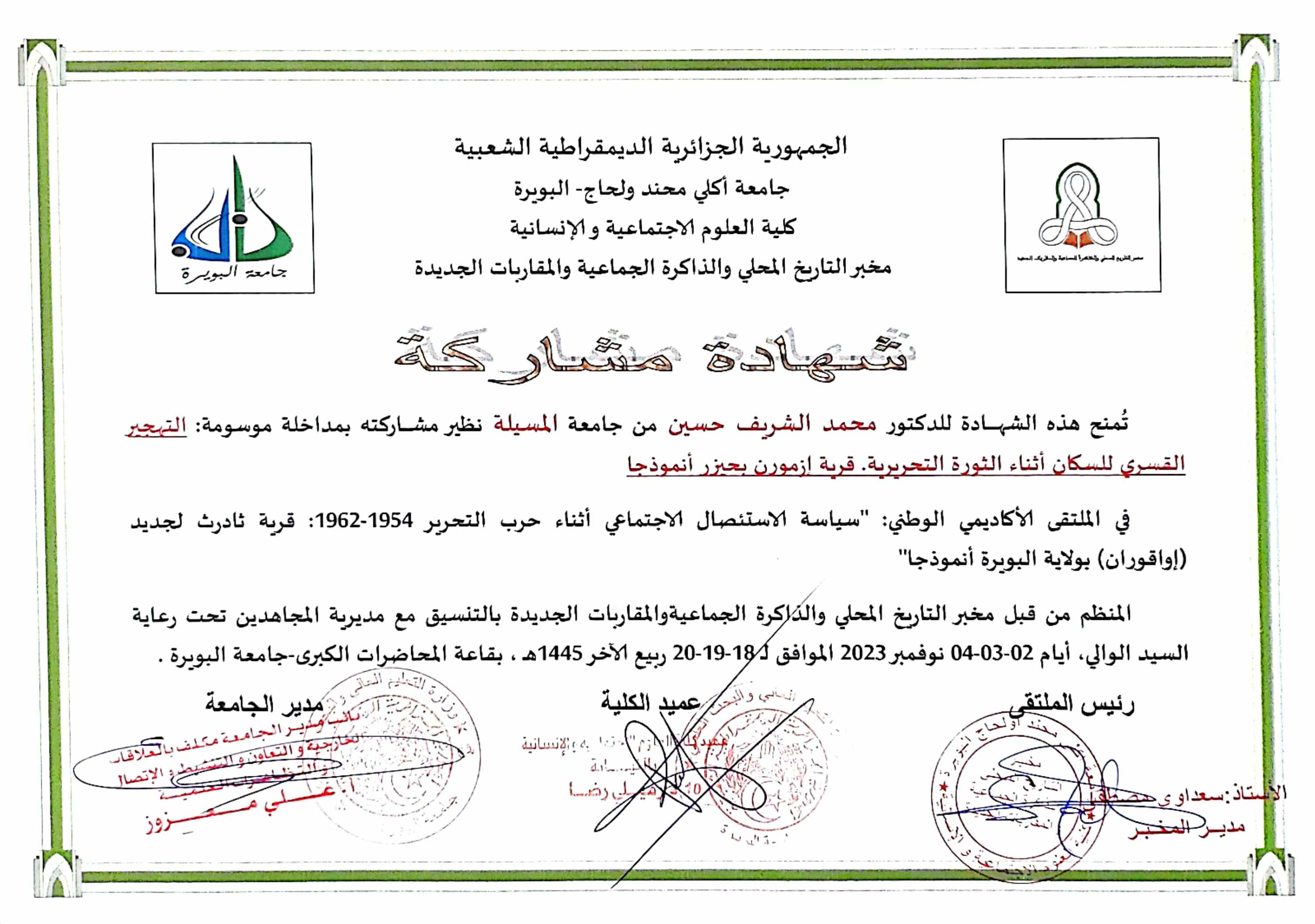 M. MOHAMMED CHERIF Hocine, (2023-07-03), "الثورة الجزائرية وصداها العالمي", [national] الذكرى الواحدة والستون لعيدي الاستقلال والشباب , جامعة البويرة