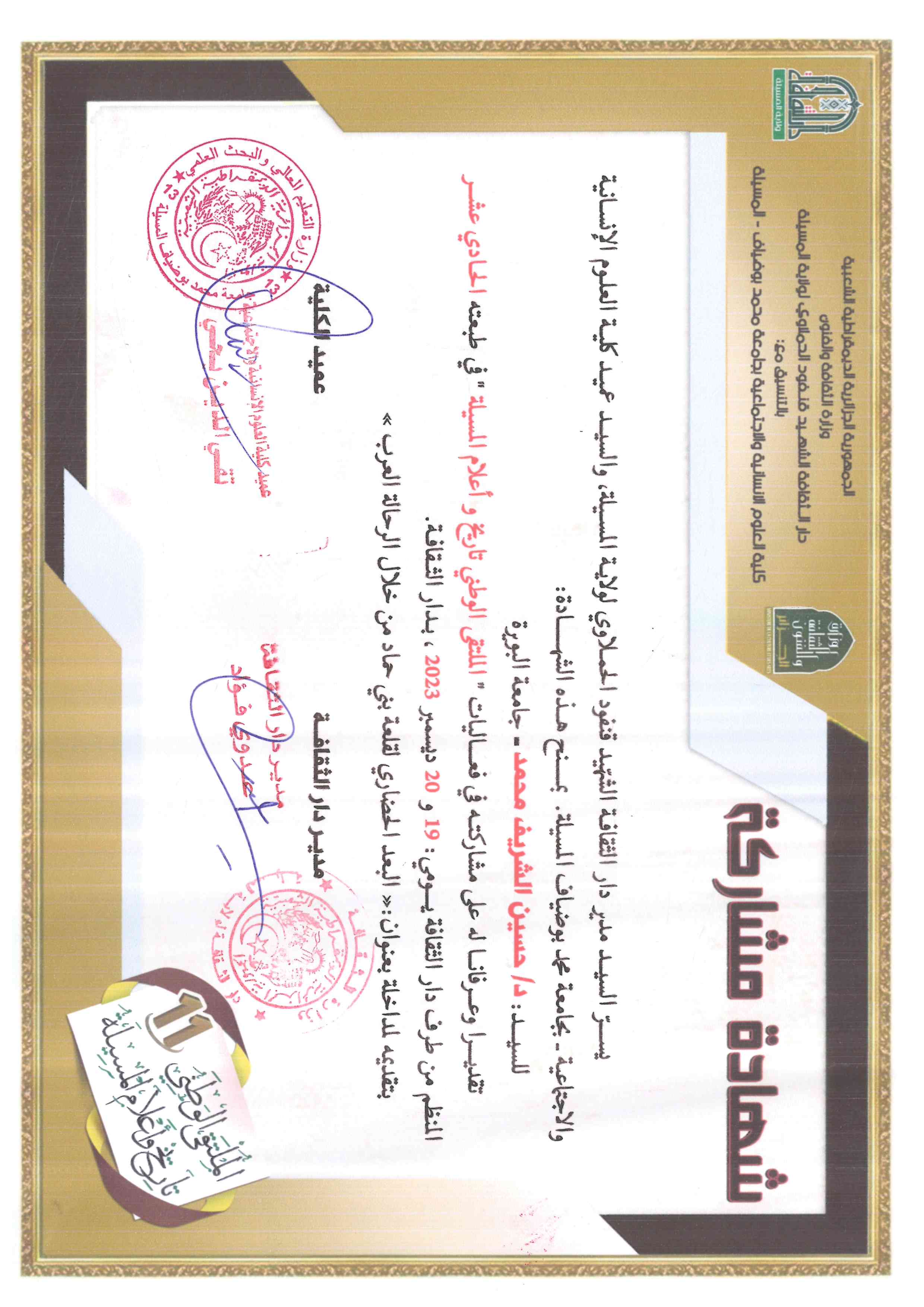 M. MOHAMMED CHERIF Hocine, (2023-12-19), "البعد الحضاري لقلعة بني حماد من خلال الرحالة العرب", [national] الملتقى الحادي عشر تاريخ وأعلام المسيلة , المسيلة