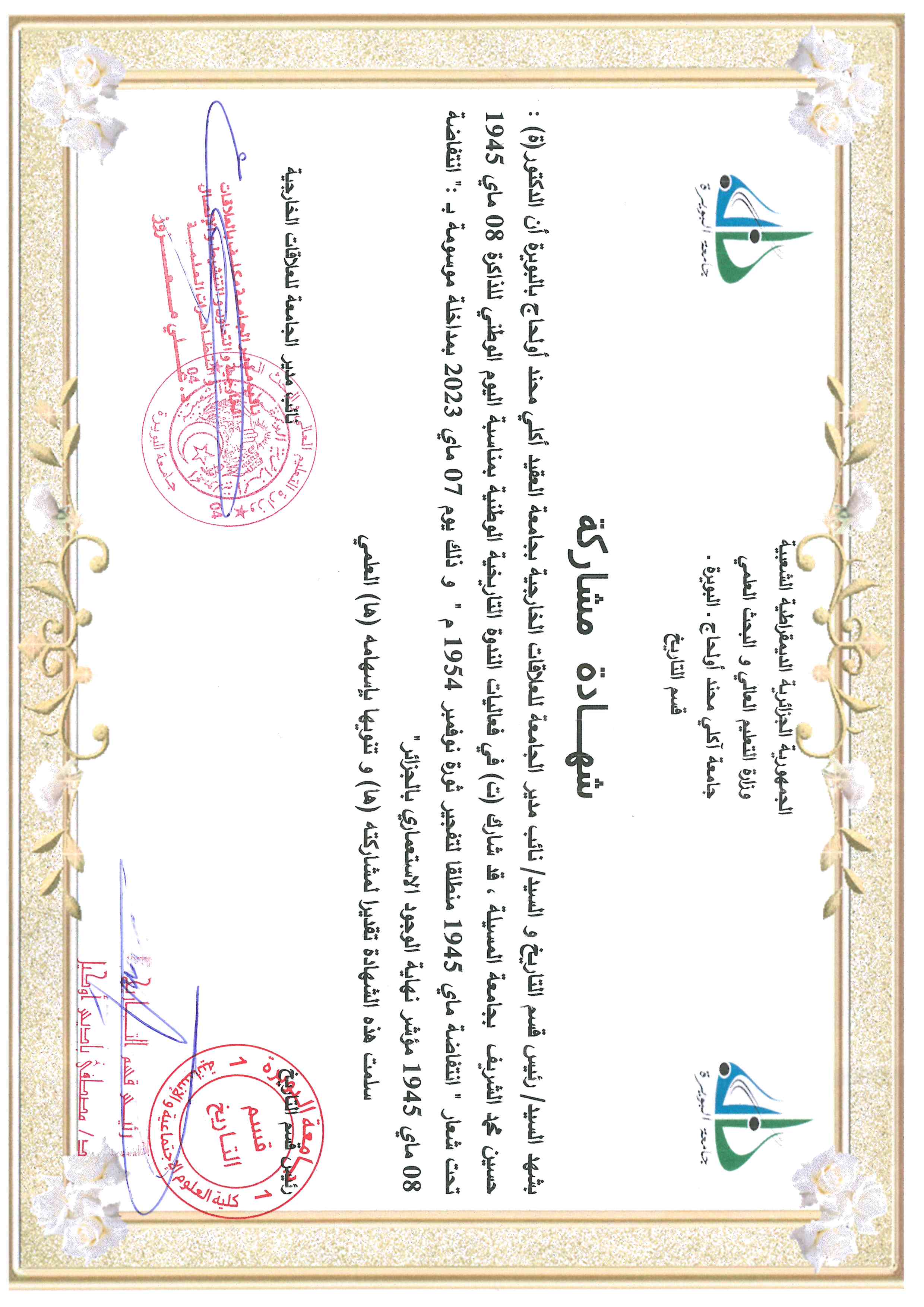 M. MOHAMMED CHERIF Hocine, (2023-05-07), "انتفاضة 08 ماي 1945 مؤشر نهاية الوجود الاستعماري بالجزائر", [national] اليوم الوطني للذاكرة 08 ماي 1945 , جامعة البويرة