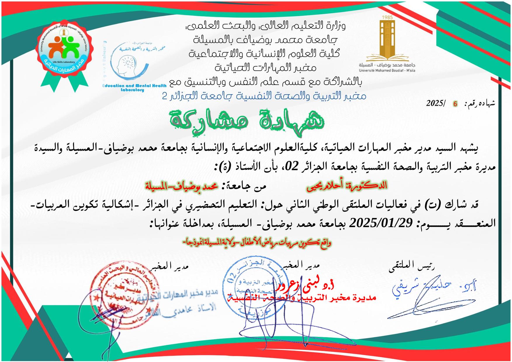 M. YAHIA Ahlam, (2025-01-29), "واقع تكوين مربيات رياض الاطفال - ولاية المسيلة أنموذجا", [national] التعليم التحضيري في الجزائر - اشكالية تكوين المربيات - , جامعة محمد بوضياف المسيلة