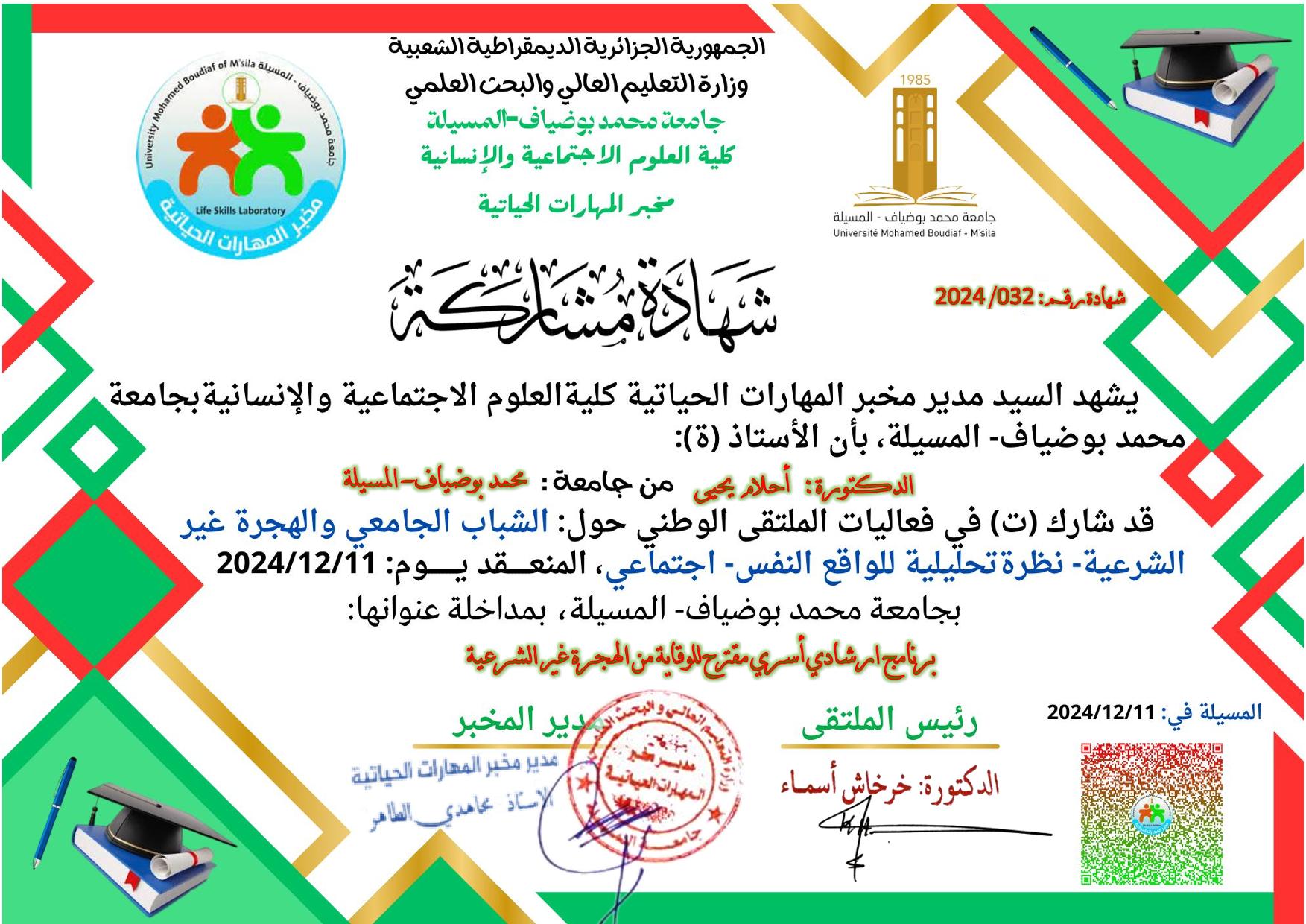 M. YAHIA Ahlam, (2024-12-11), "برنامج ارشادي اسري مقترح للوقاية من الهجرة غير الشرعية", [national] الشباب الجامعي والهجرة غير الشرعية - نظرة تحليلية للواقع النفس اجتماعي - , جامعة محمد بوضياف المسيلة