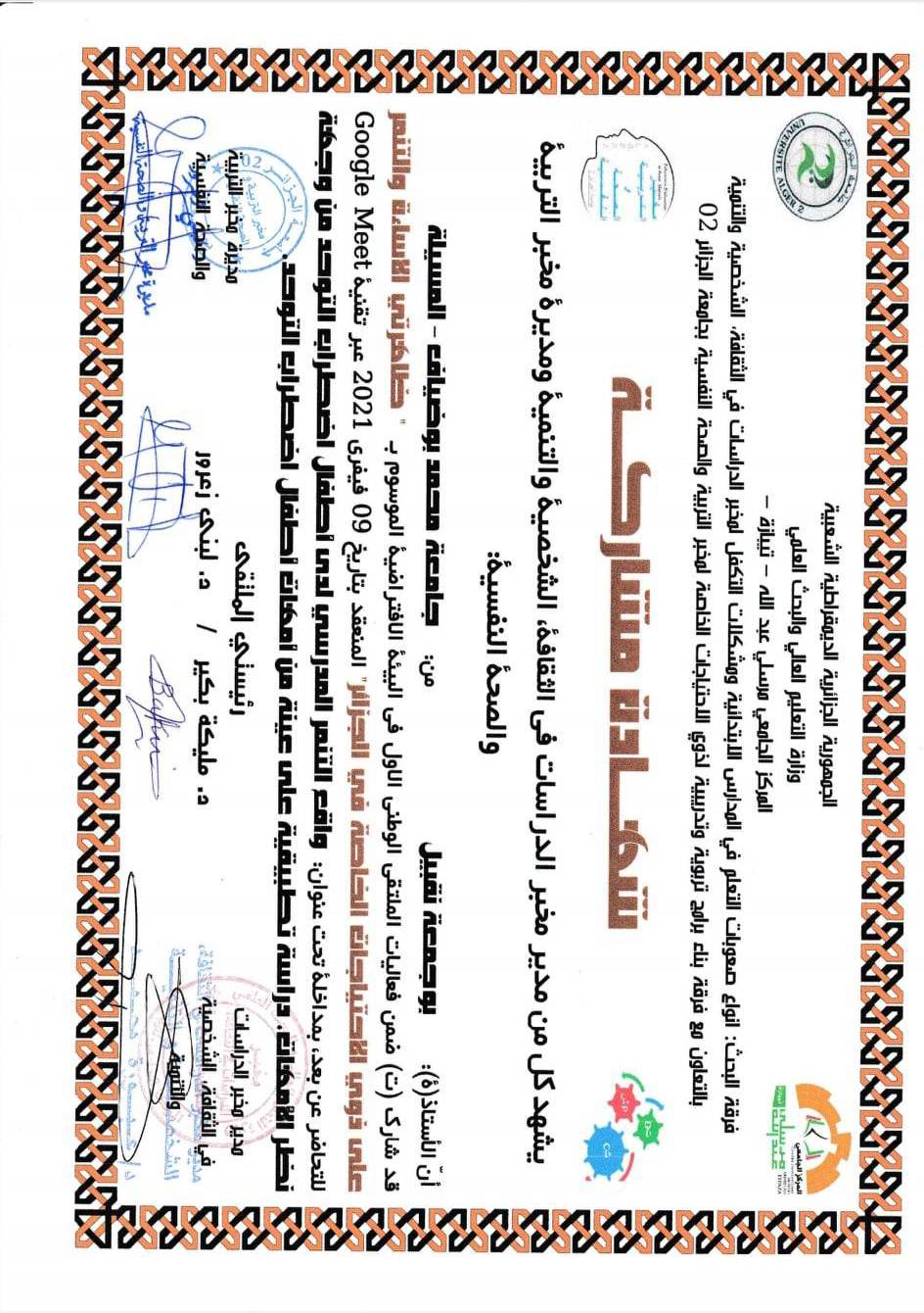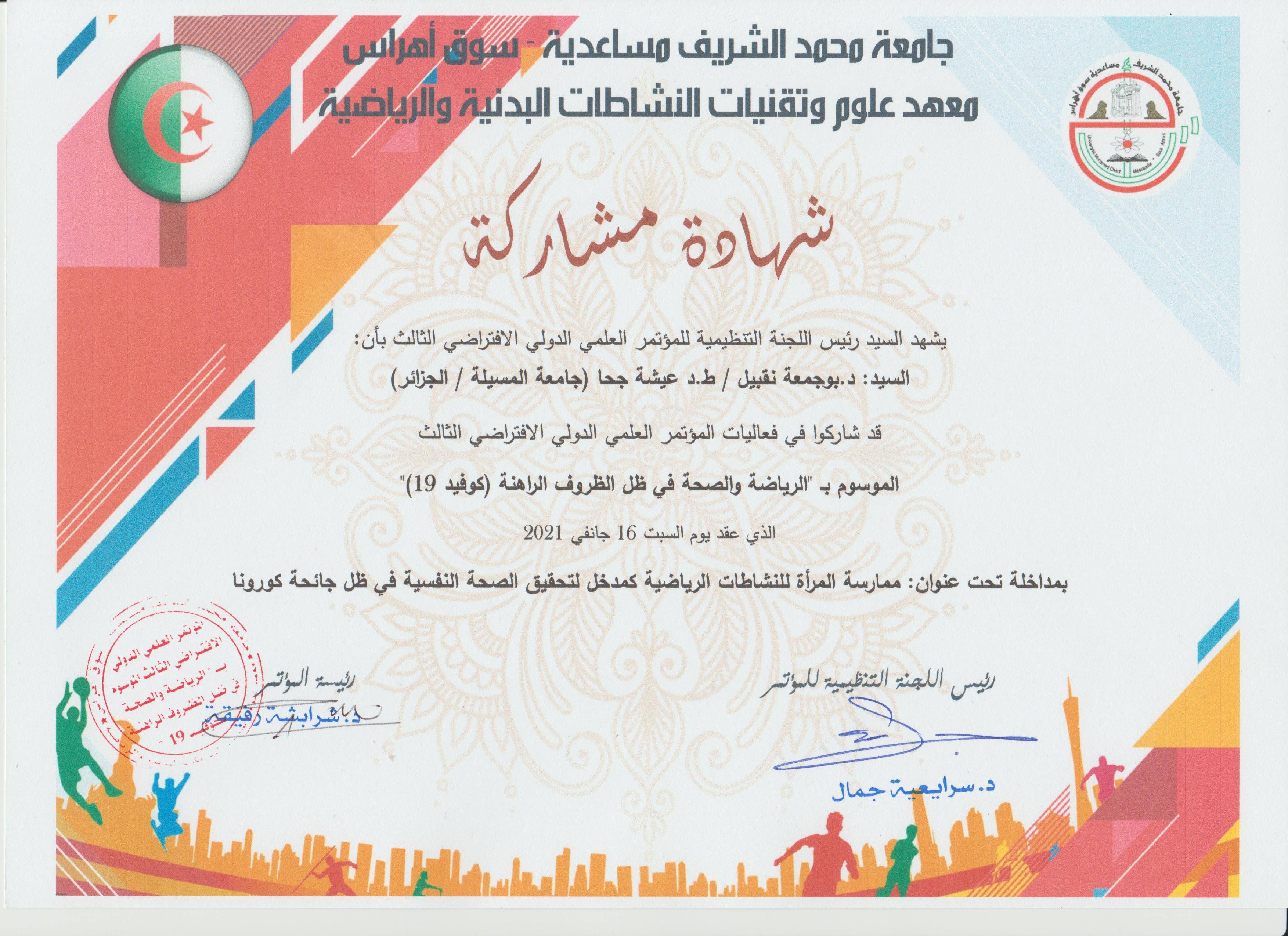M. BOUDJEMA Nekbil, (2021), "ممارسة المرأة للنشاطات الرياضية كمدخل لتحقيق الصحة النفسية في ظل جائحة كورونا", [international] الرياضة و الصحة في ظل الظروف الراهنة كوفيد 19 , جامعة سوق اهراس
