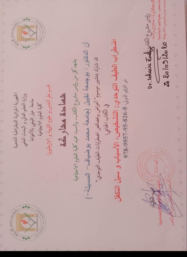 M. BOUDJEMA Nekbil, (2025-12-02), "الرهاب الاجتماعي و العلاج الحديث", [national] فوبيا الحياة المدرسية اليات الوقاية و التشخيص و التكفل , جامعة المسيلة