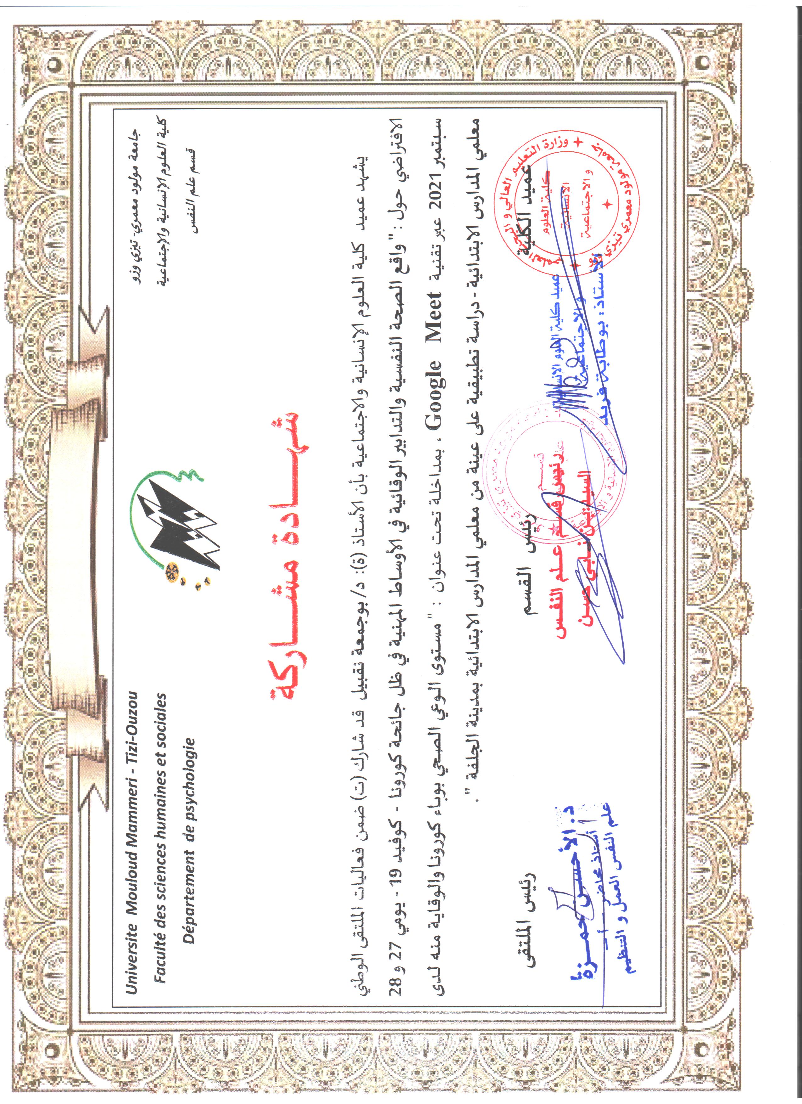 M. BOUDJEMA Nekbil, (2021), "مستوى الوعي الصحي بوباء كورونا والوقاية منه لدى العاملين بالمدارس الابتدائية. دراسة تطبيقية على عينة من معلمي المدارس الابتدائية بمدينة الجلفة.", [national] واقع الصحة النفسية و التدابيرالوقائية في الاوساط المهنية في ظل جائحة كورونا كوفيد 19 , جامعة تيزي وزو