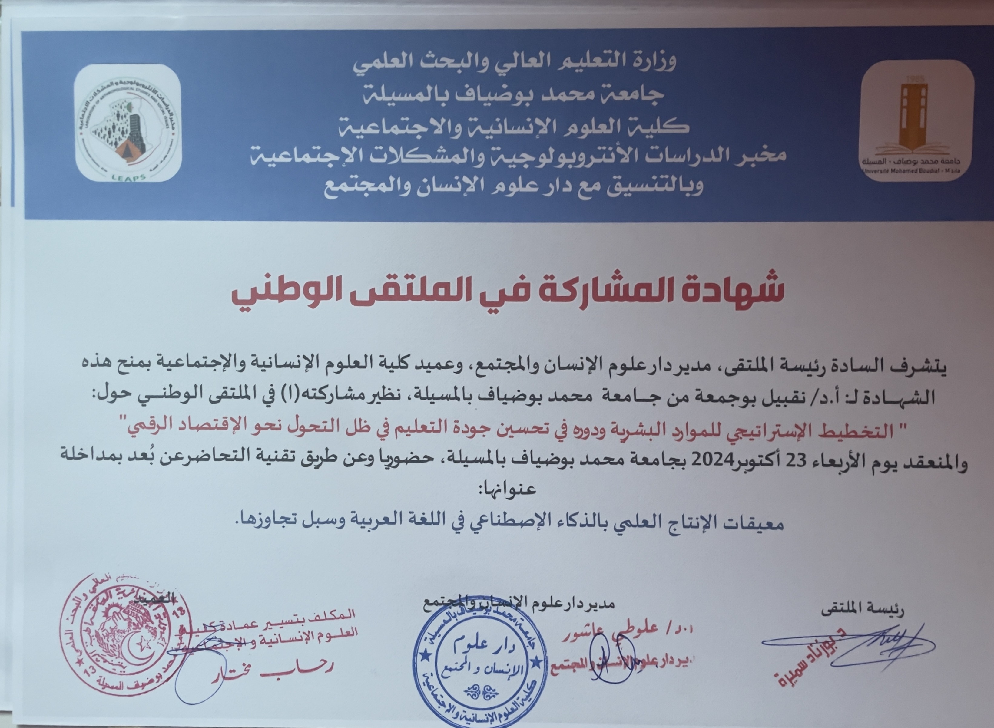 M. BOUDJEMA Nekbil, (2024-10-23), "معيقات الانتاج العلمي بالذكاء الاصطناعي في اللغة العربية و سبل تجاوزها", [national] التخطيط الاستراتيجي للموارد البشرية و دوره في تحسين جودة التعليم في ظل التحول نحو الاقتصاد الرقمي , جامعة المسيلة
