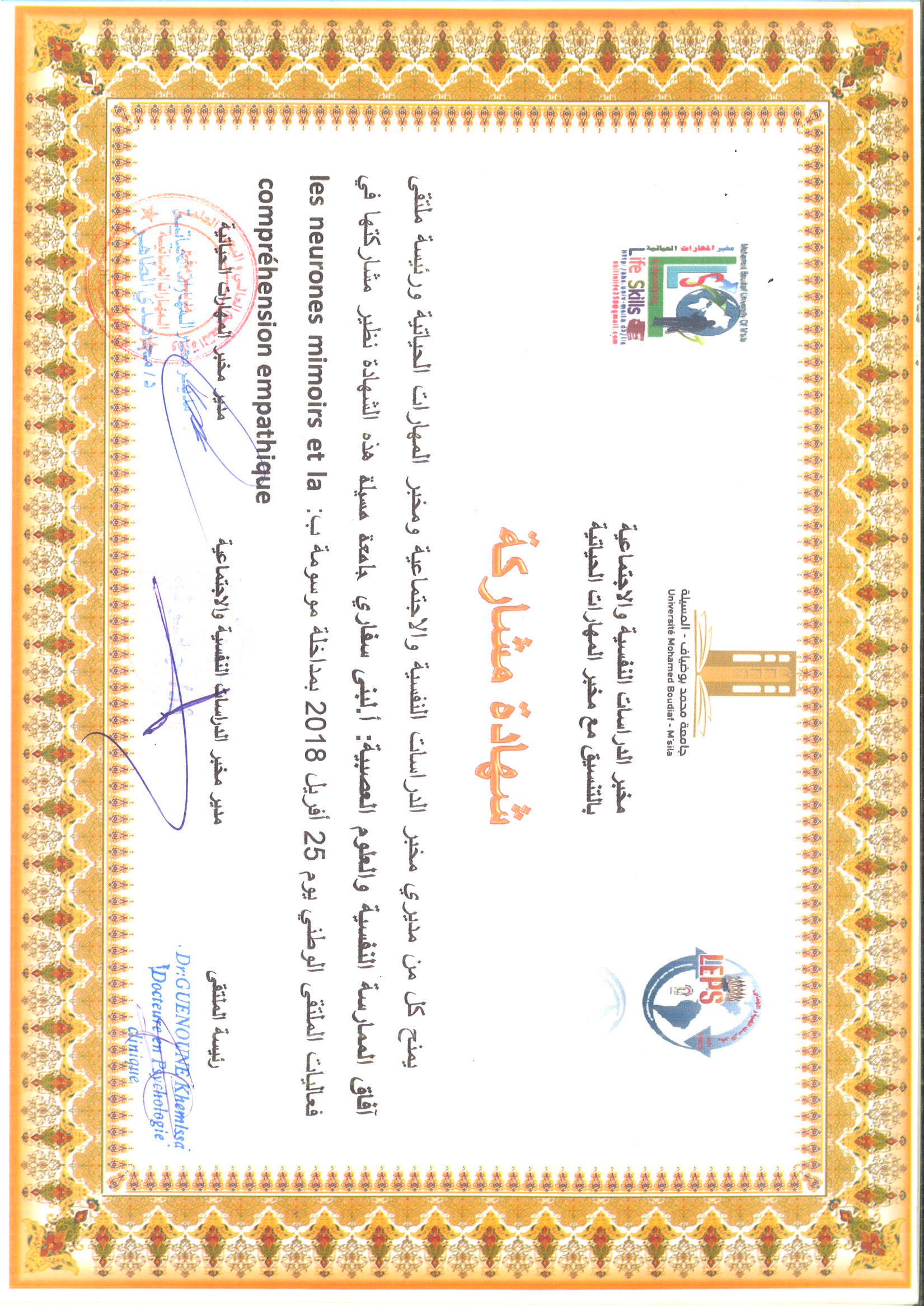 M. SEFFARI Loubna, (2018), "افاق الممارسة النفسية و العلوم العصبية", [national] les neurones miroirs et la compréhension empathique , جامعة محمد بوضياف مسيلة
