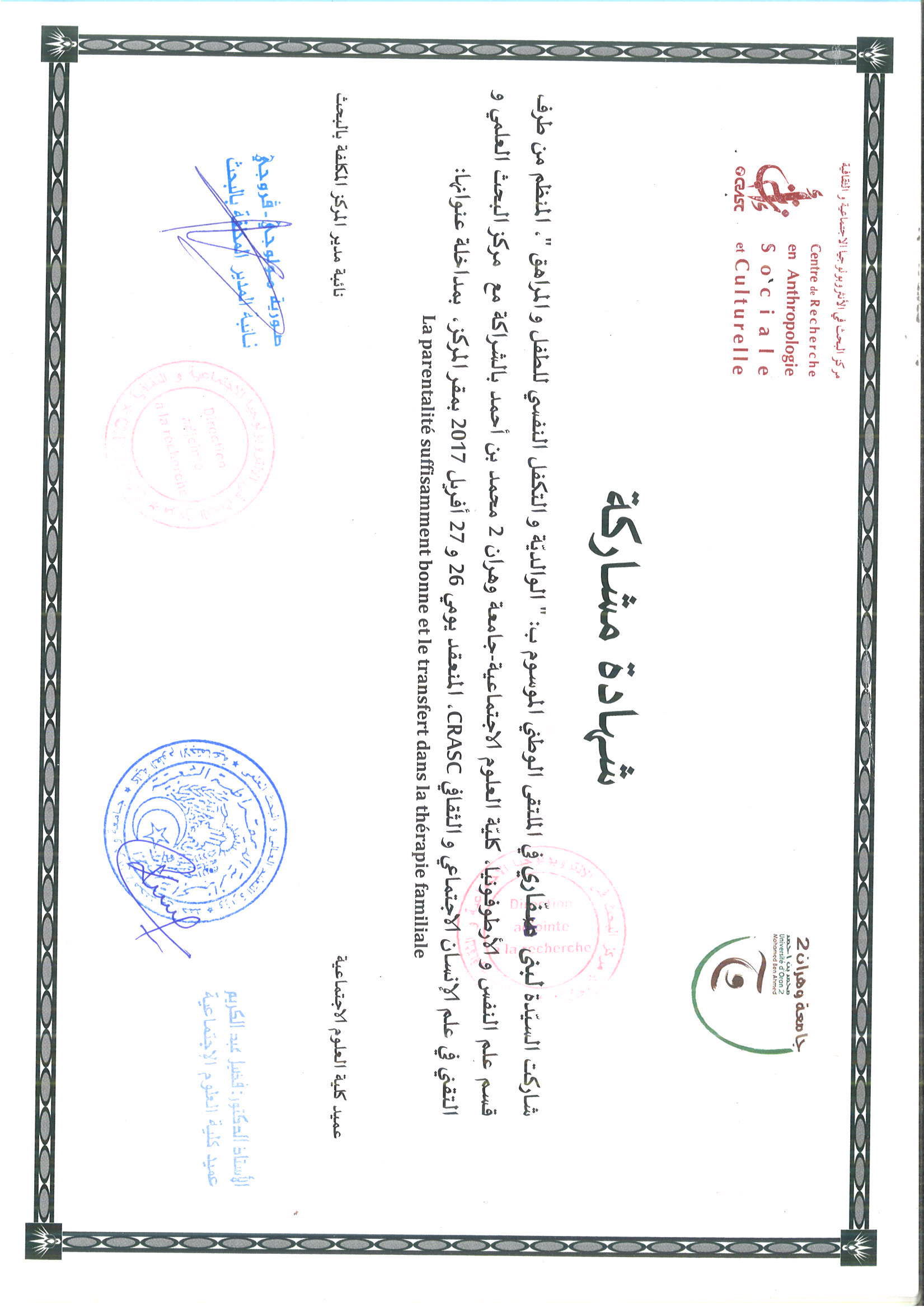 M. SEFFARI Loubna, (2017), "الوالدية و التكفل النفسي للطفل و المراهق", [national] la parentalité suffisamment bonne et le transfert dans la thérapie familiale , جامعة وهران 2 محمد بن احمد
