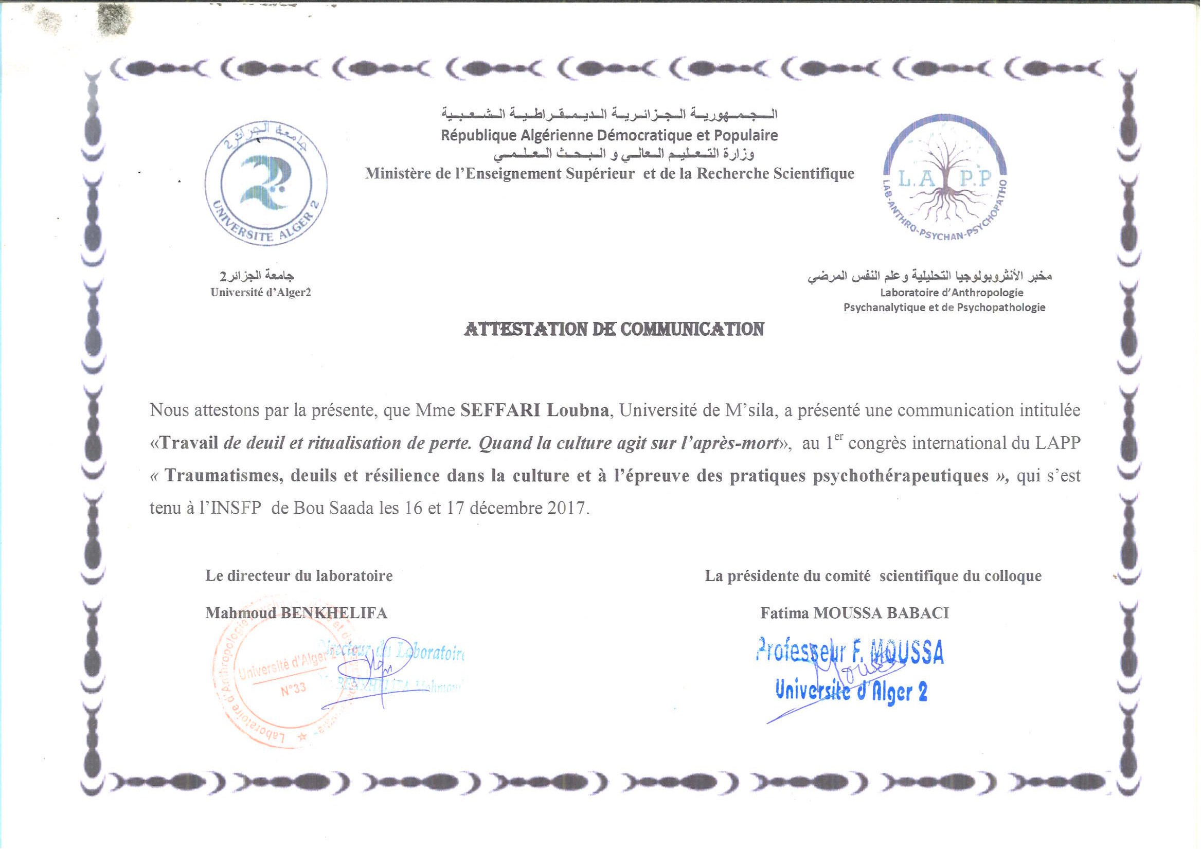M. SEFFARI Loubna, (2017), "traumatisme , deuil et resilience dans la culture et à l’épreuve des pratiques psychothérapeutiques", [international] travail de deuil et ritualisation de perte.quand la culture agit sur l’après mort , 2 جامعة الجزائر