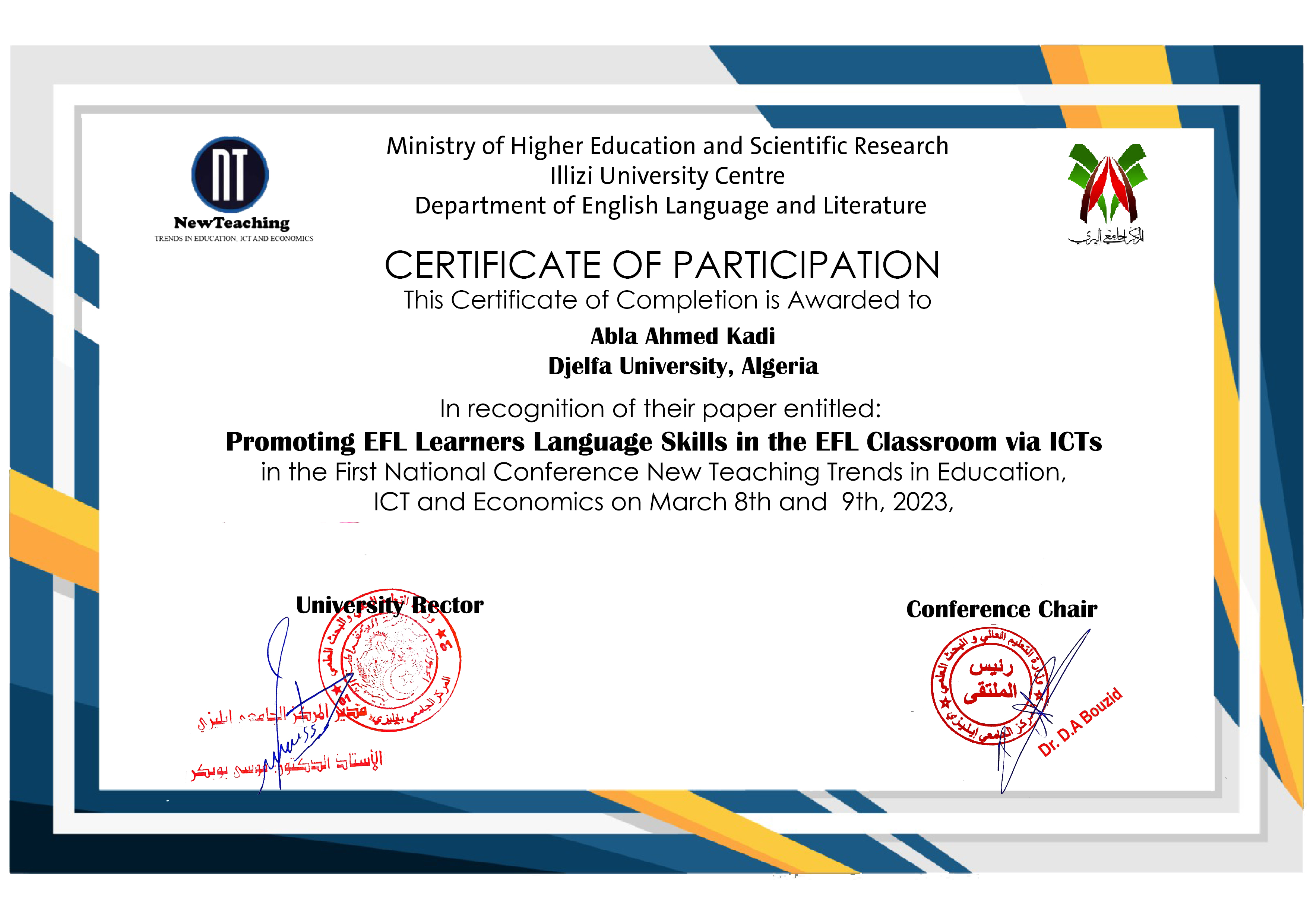 M. AHMED KADI Abla, (2023-03-09), "Promoting EFL Learners Language Skills in the EFL Classroom via ICTs", [national] New Teaching Trends in Education, ICTs and Economics , Illizi University Center