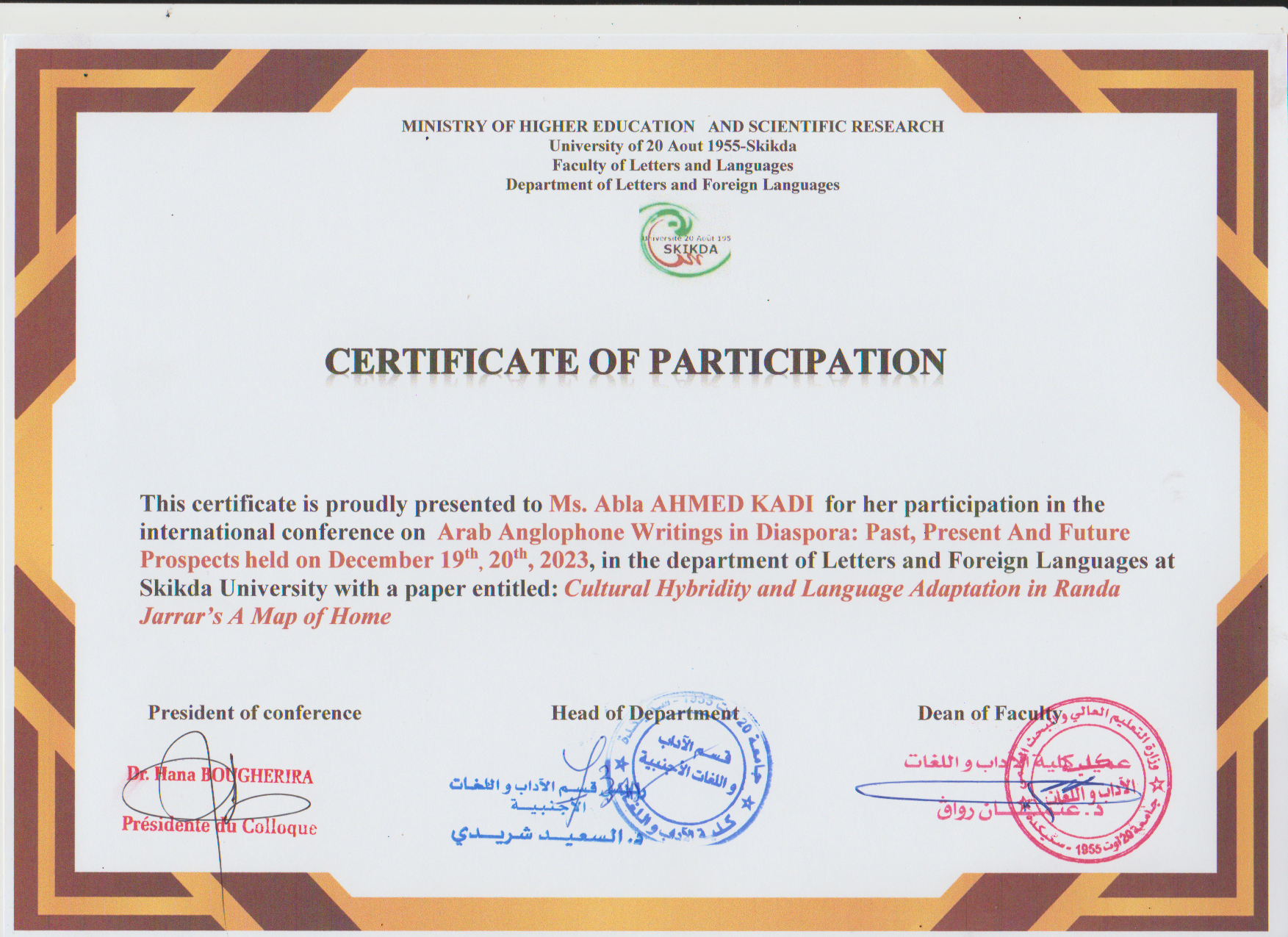 M. AHMED KADI Abla, (2023-04-27), "Transcultural Tapestry of Arab American Identity in Diana Abu-Jaber's The Language of Baklava", [national] Borders/Crossing Borders in Contemporary Literature and Culture , University of M'sila
