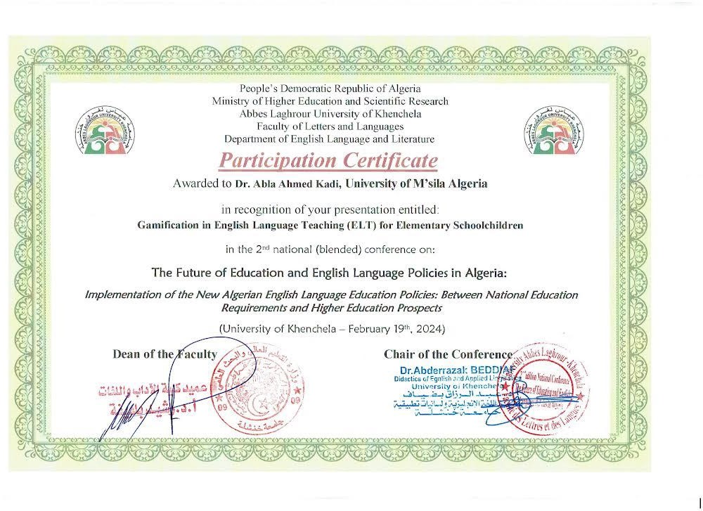 M. AHMED KADI Abla, (2024-02-19), "Gamification in English Language Teaching (ELT) for Elementary School Children", [national] The Future of Education and English Language Policies in Algeria , Khenchela
