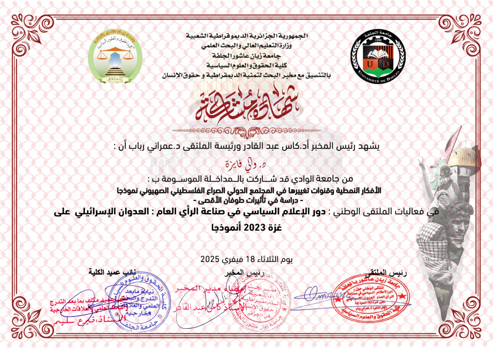 M. OUALI Fayza, (2025-02-18), "الأفكار النمطية وقنوات تغييرها في المجتمع الدولي .الصراع الفلسطينيين الصهيوني نموذجا -دراسة في تأثيرات طوفان الأقصى", [national] دور الاعلام السياسي في صناعة الرأي العام :العدوان الاسرائيلي على غزة 2023 نموذجا , جامعة زيدان عاشور _الجلفة-