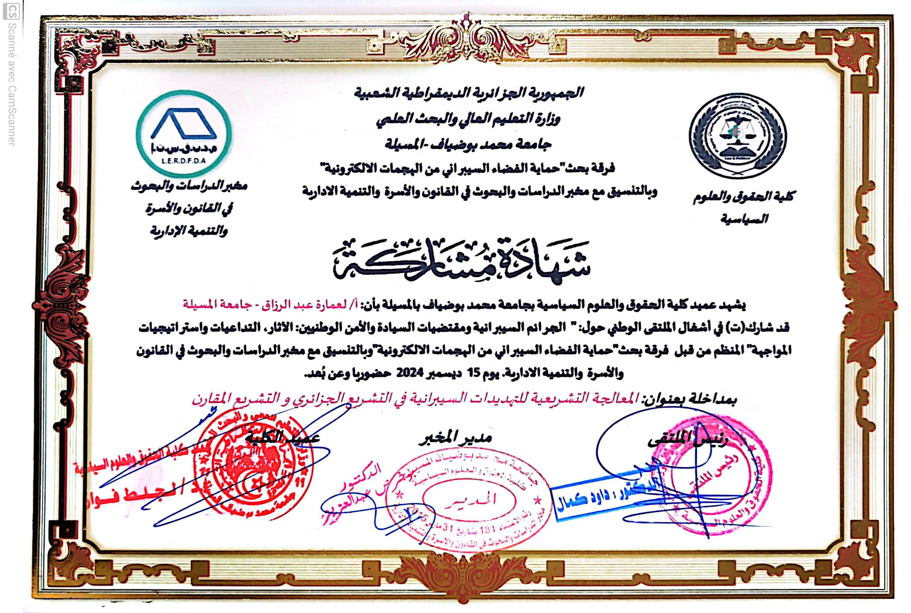 M. LAMARA Abderrazak, (2024-12-15), "المعالجة التشريعية للتهديدات السيبرانية في التشريع الجزائري والتشريع المقارن", [national] الجرائم السيبرانية ومقتضيات السيادة والأمن الوطنيين , جامعة المسيلة