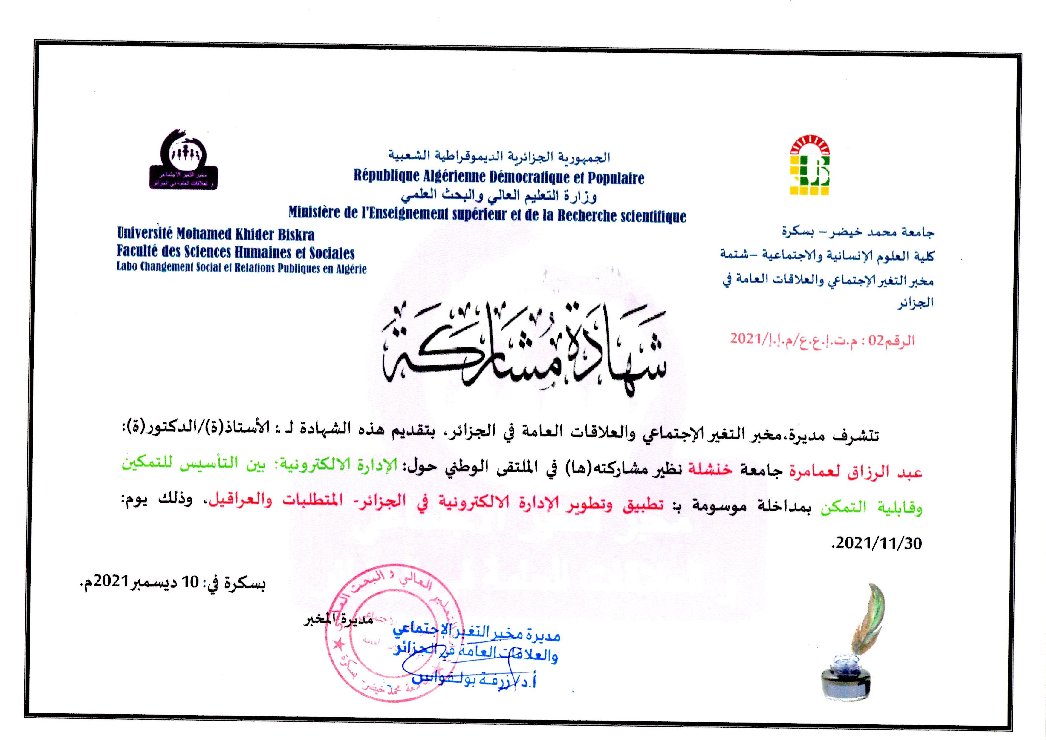 M. LAMARA Abderrazak, (2021-11-30), "تطبيق وتطوير الإدارة الالكترونية في الجزائر المتطلبات والعراقيل", [national] الإدارة الالكترونية بين التأسيس للتمكين وقابلية التمكن , جامعة بسكرة