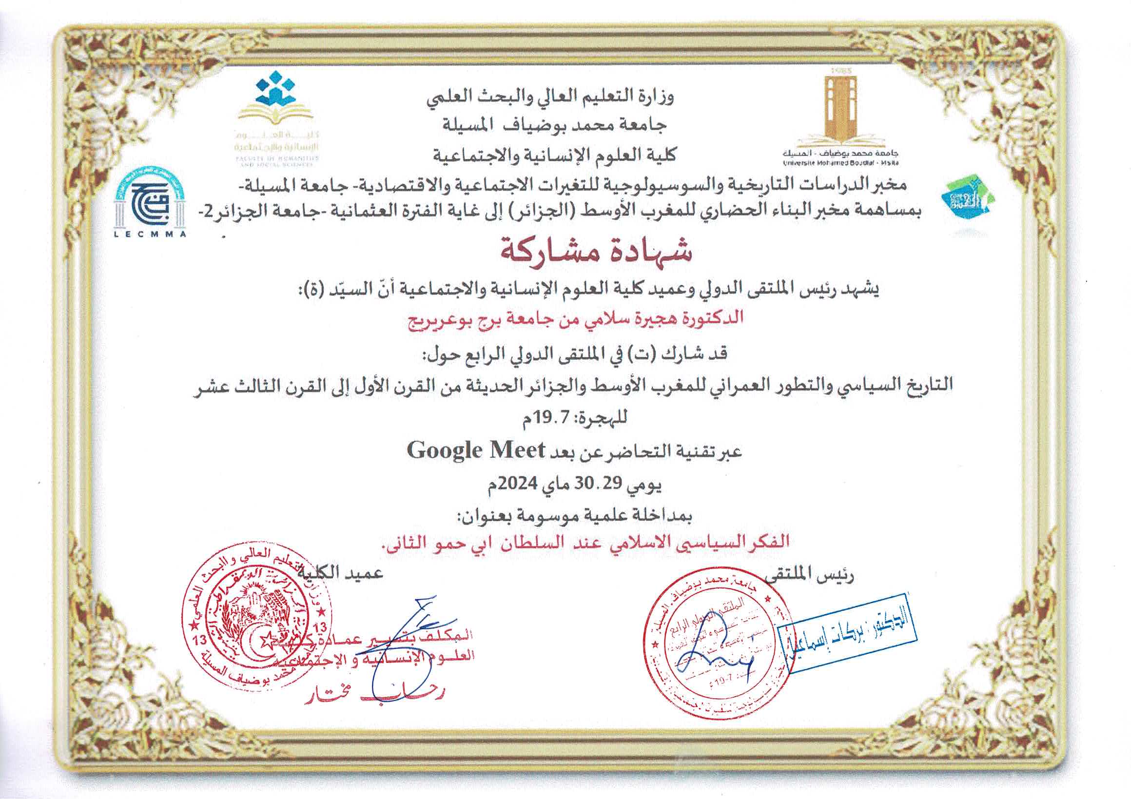 M. SELLAMI Hadjira, (2024-05-30), "الفكر السياسي الاسلامي عند السلطان أبي حمو الثالث", [international] التاريخ السياسي والتطور العمراني للمغرب الأوسط والجزائر الحديثة من القرن الـأول الى القرن الثالث عشر للهجرة عشر للهجرة 7.19م , جامعة محمد بوضياف - المسيلة