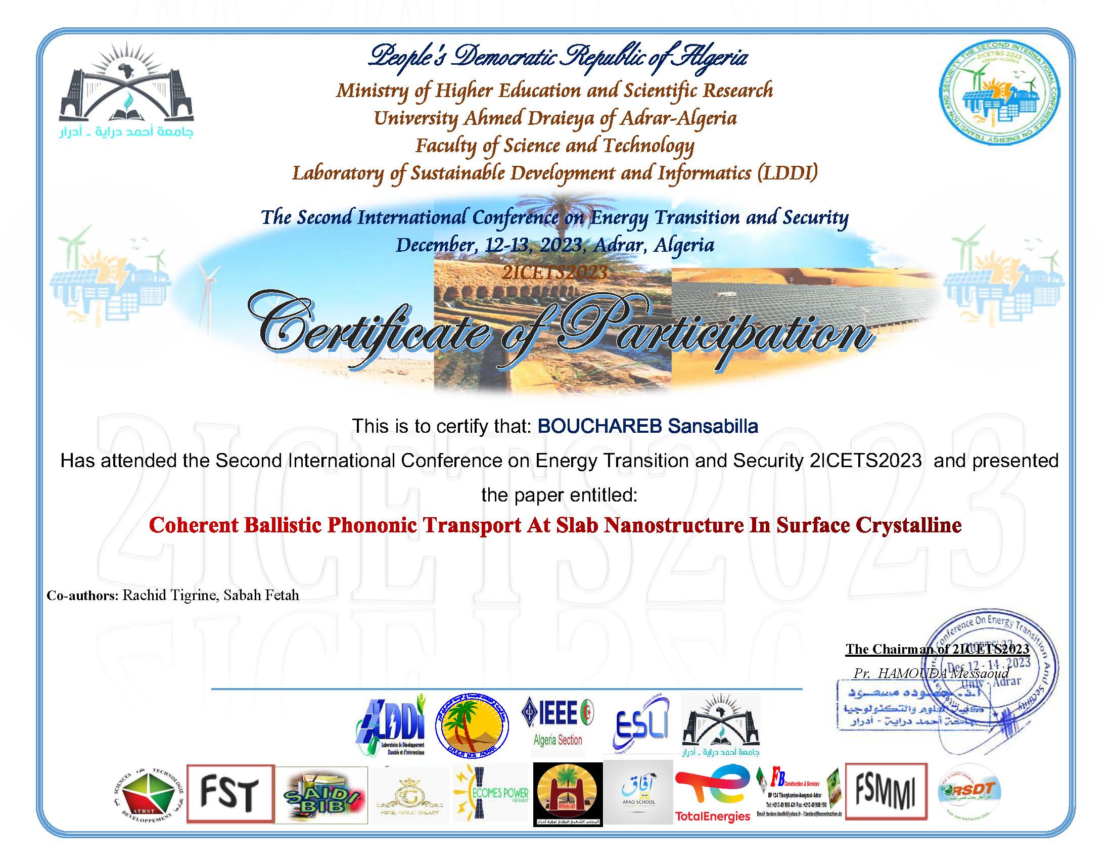 M. FETAH Sabah, (2023-12-12), "coherent ballistic phonenic transport at slab nanostructure in surface cristalline", [international] The Second International Conference on Energy Transition and Security , Adrar.Algeria