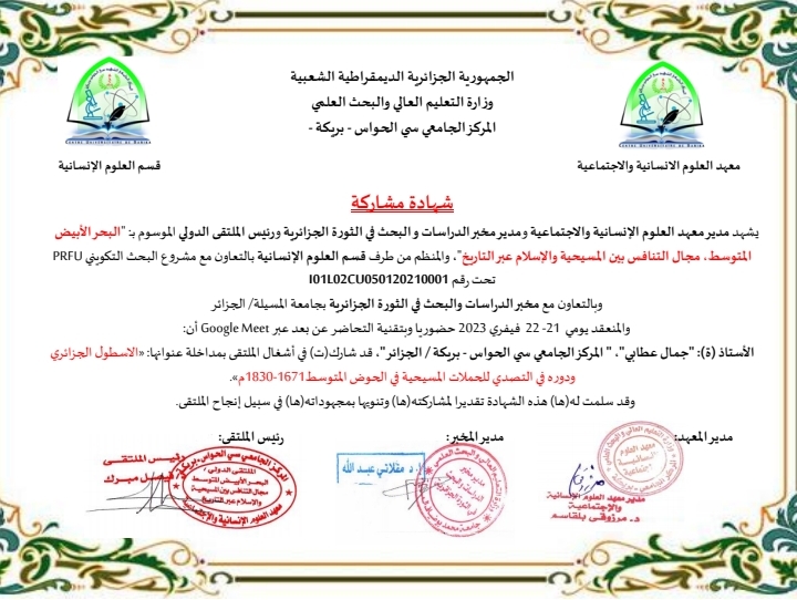 M. ATTABI Djamel, (2023-02-21), "الاسطول الجزائري و دوره في التصدي للحملات المسيحية في الحوض المتوسط 1671/1830", [national] البحر الابيض المتوسط.مجال التنافس بين المسيحية و الاسلام عبر التاريخ , المركز الجامعي العقيد الحواس/بريكة