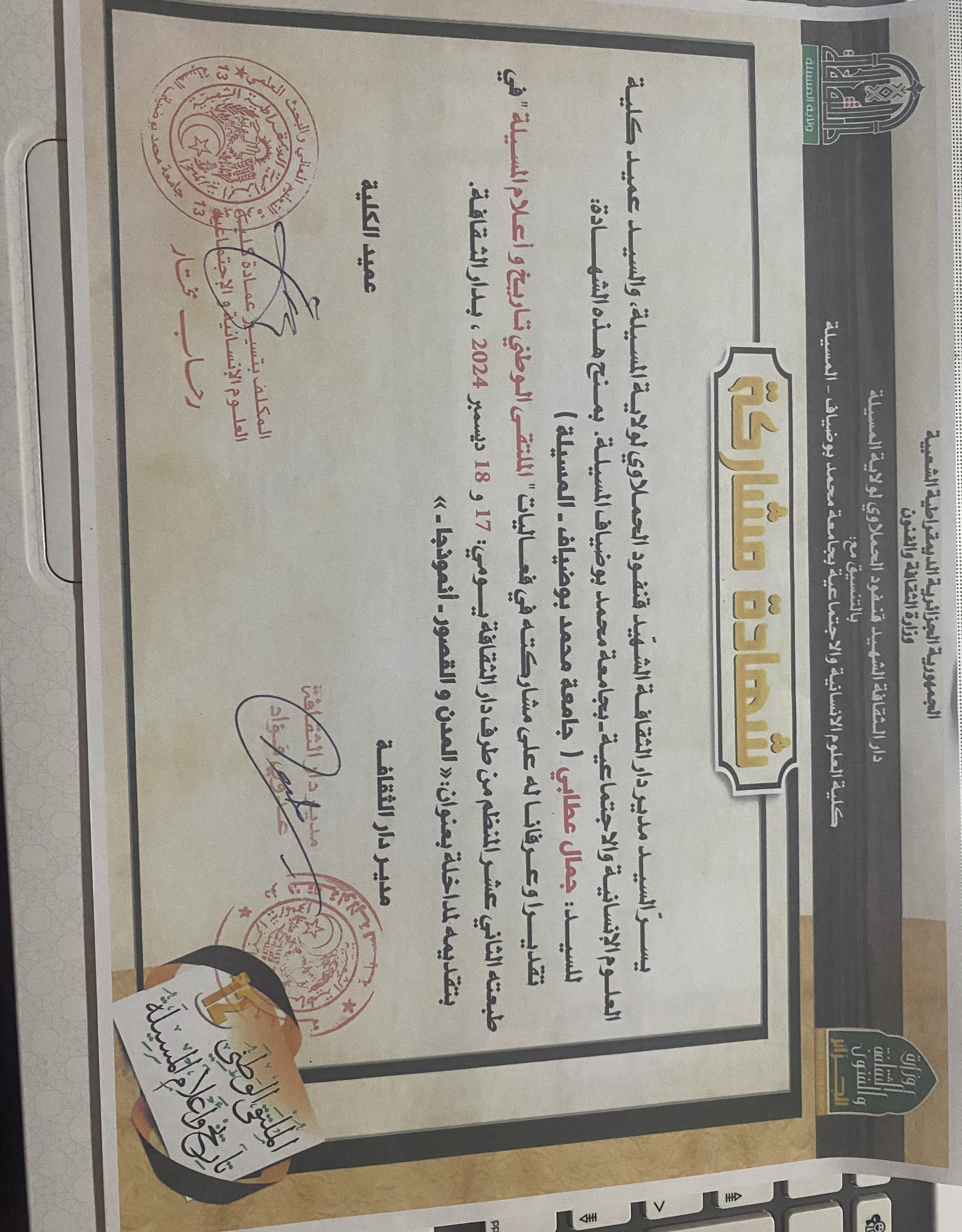M. ATTABI Djamel, (2024-12-17), "المدن و القصور -نموذجا-", [national] الملتقى الوطني تاريخ واعلام المسيلة , دار الثقافة المسيلة