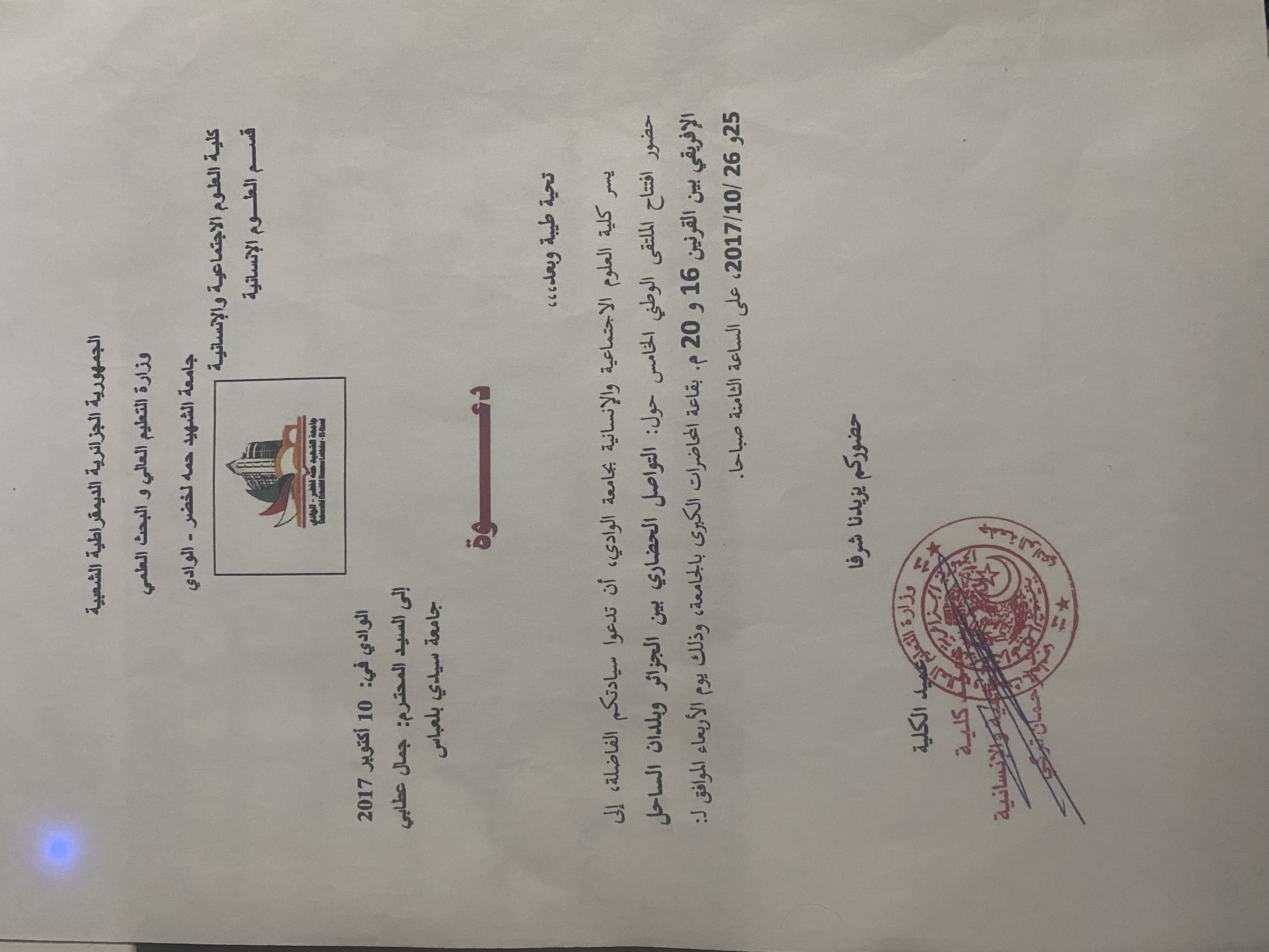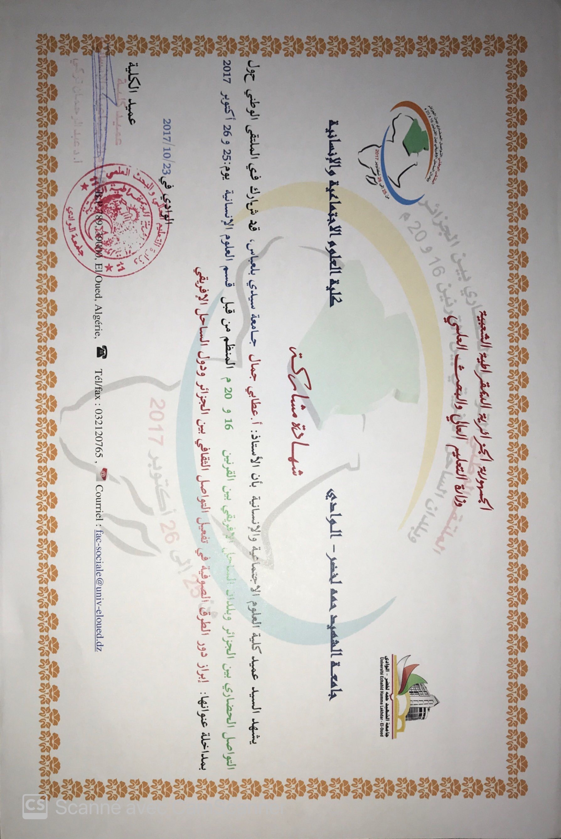 M. ATTABI Djamel, (2017-10-30), "ابراز دور الطرق الصوفية في تفعيل التواصل الثقافي بين الجزائرودول الساحل الافريقي", [national] التواصل الحضاري بين الجزائر و دول الساحل الافريقي , جامعة الشهيد حمة لخضر الوادي