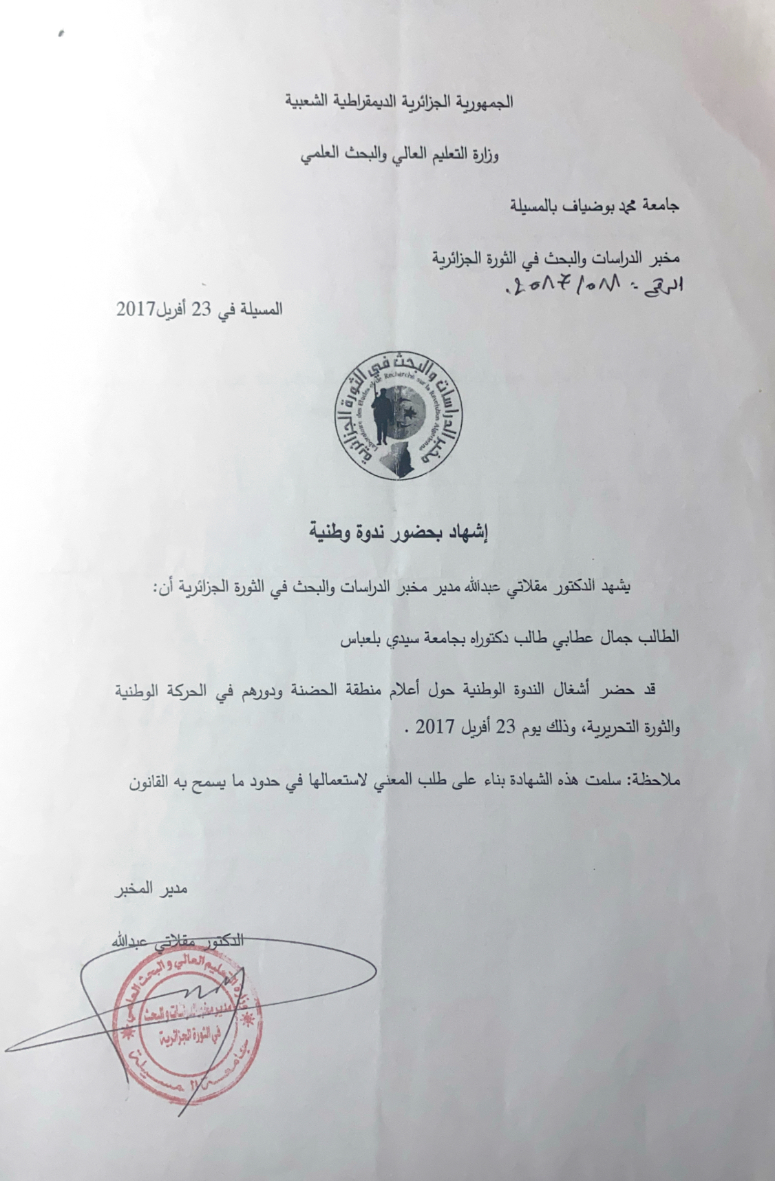 M. ATTABI Djamel, (2017-04-23), "اعلام منطقة الحضنة و دورهم في الحركة الوطنية و الثورة التحريرية", [national] الندوة الوطنية حول اعلام منطقة الحضنة و دورهم في الحركة الوطنية و الثورة التحريرية , جامعة محمد بوضياف المسيلة