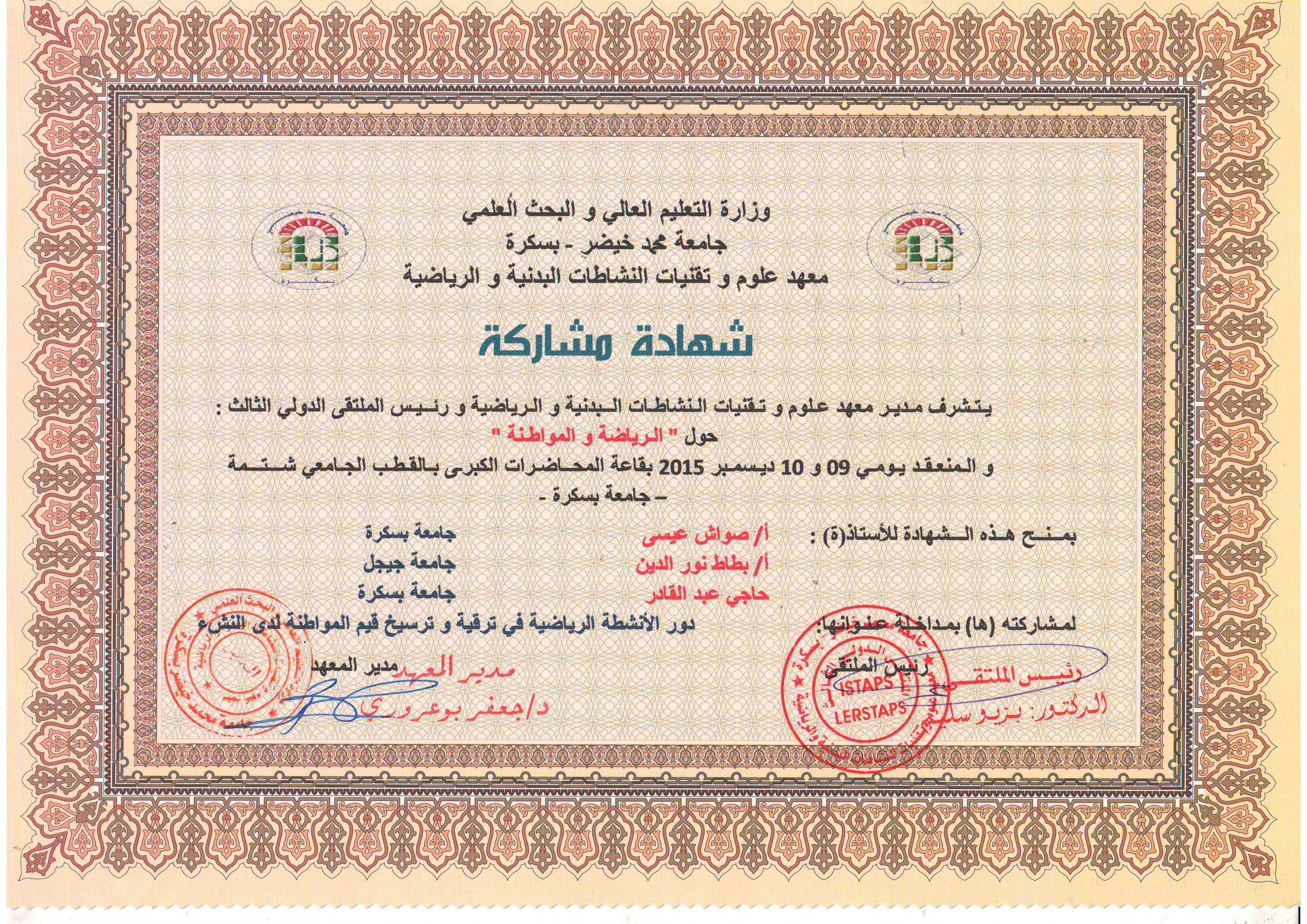 M. BETAT Noureddine, (2015), "دور الأنشطة الرياضية في ترقية و ترسيخ قيم المواطنة لدى النشئ", [international] الرياضة و المواطنة , جامعة بسكرة
