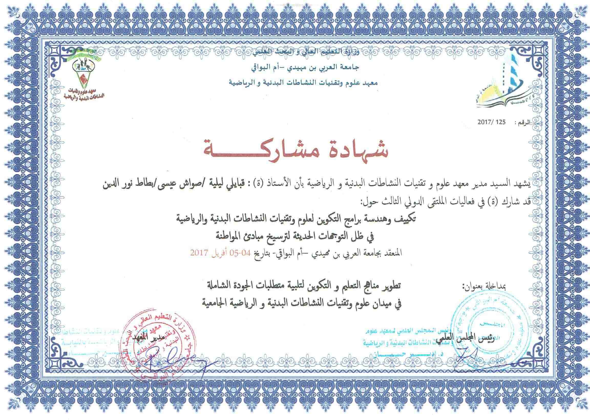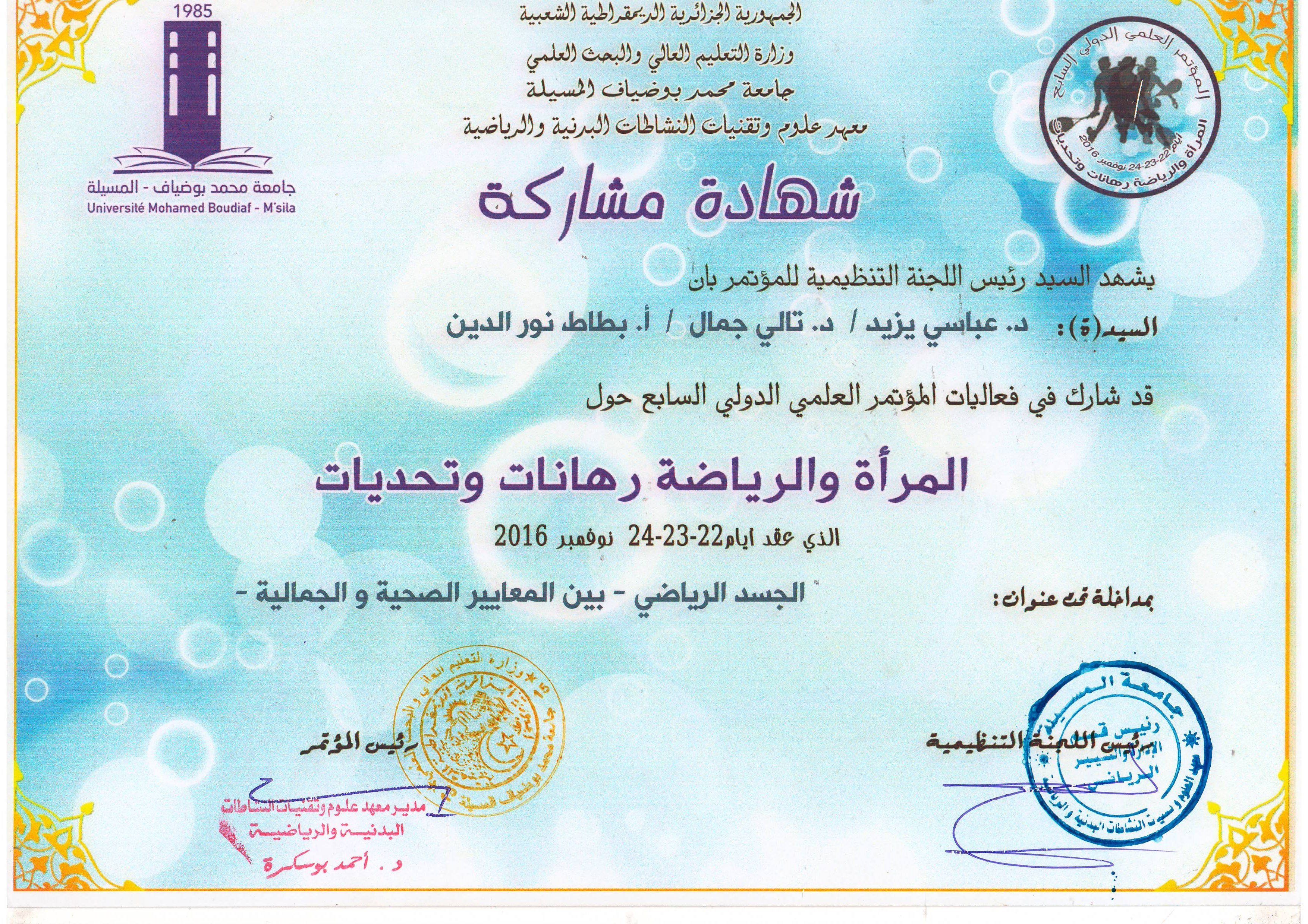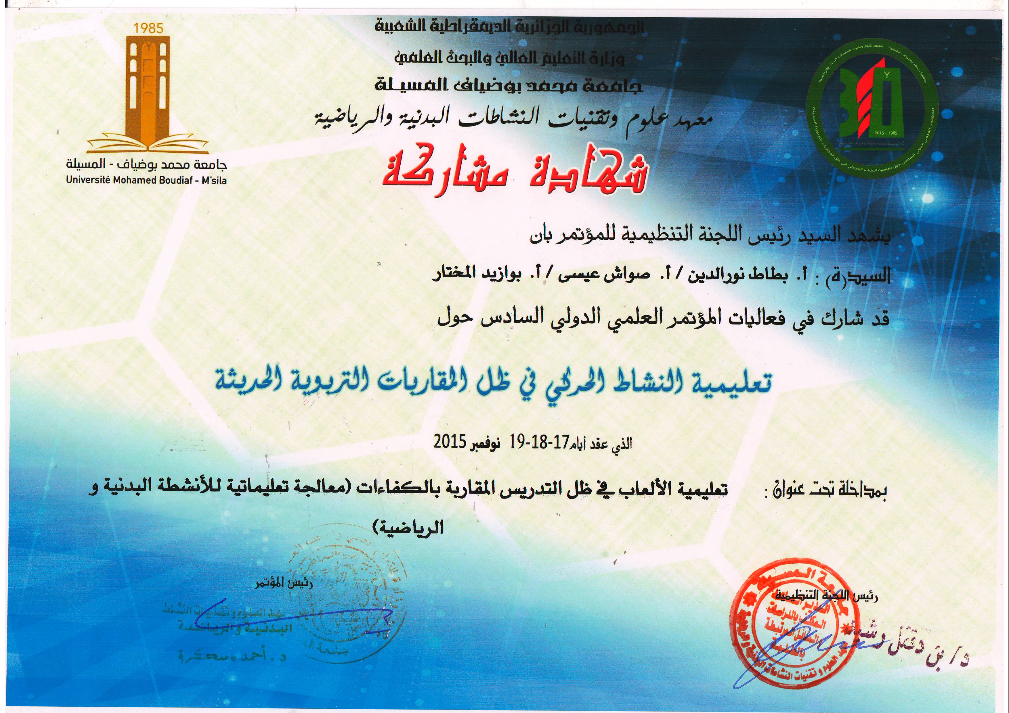 M. BETAT Noureddine, (2016), "الجسد الرياضي بين المعايير الصحية و الجمالية", [international] المراة و الرياضة رهانات و تحديات , معهد علوم وتقنيات النشاطات البدنية و الرياضية جامعة المسيلة